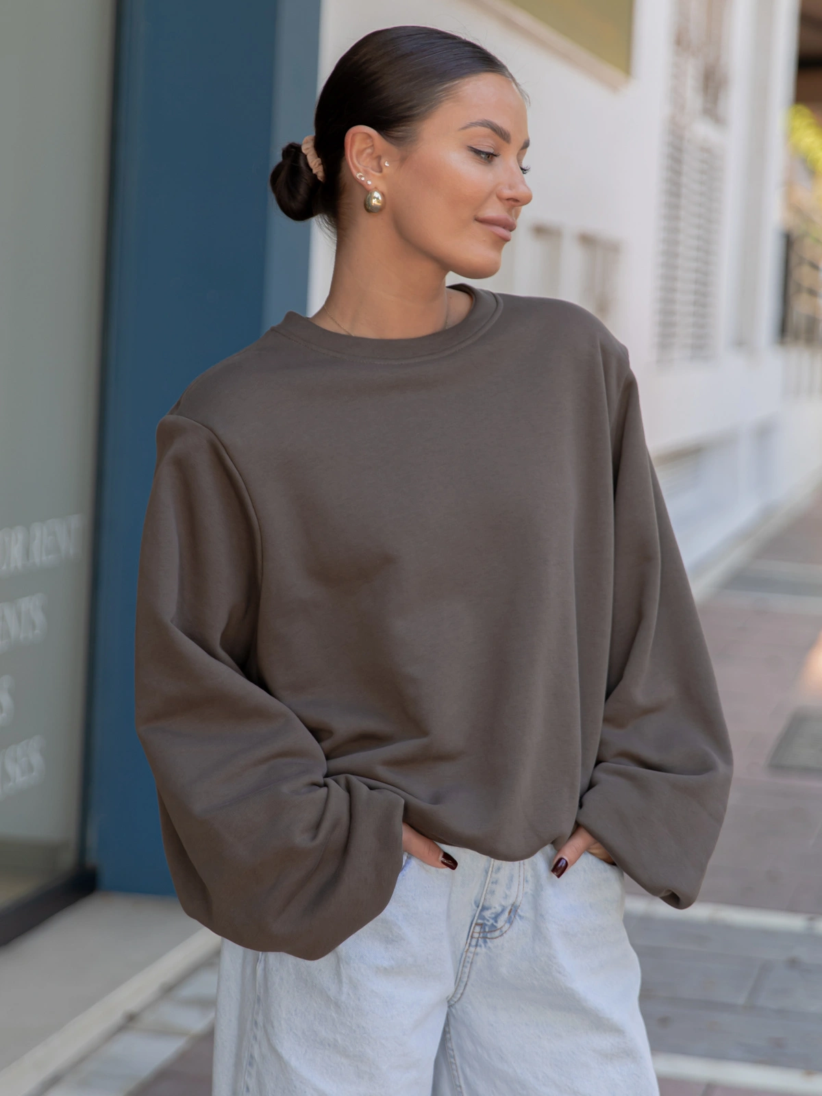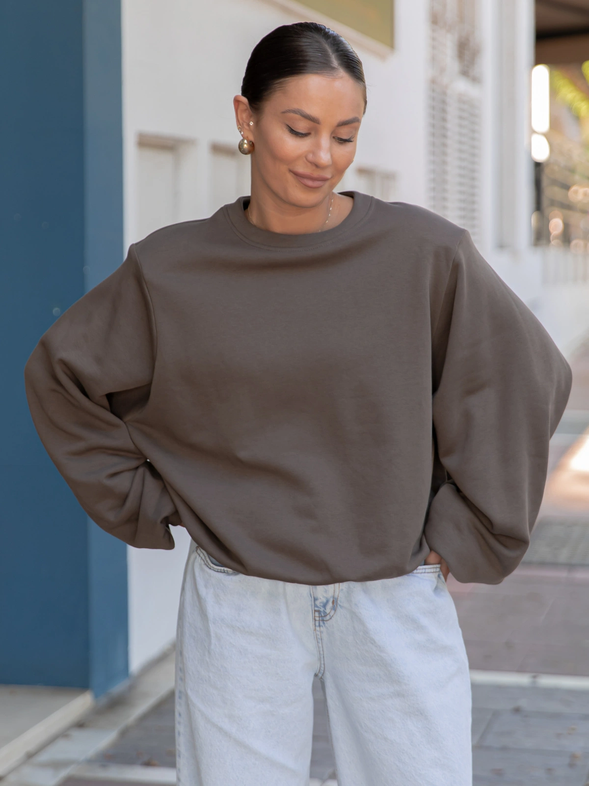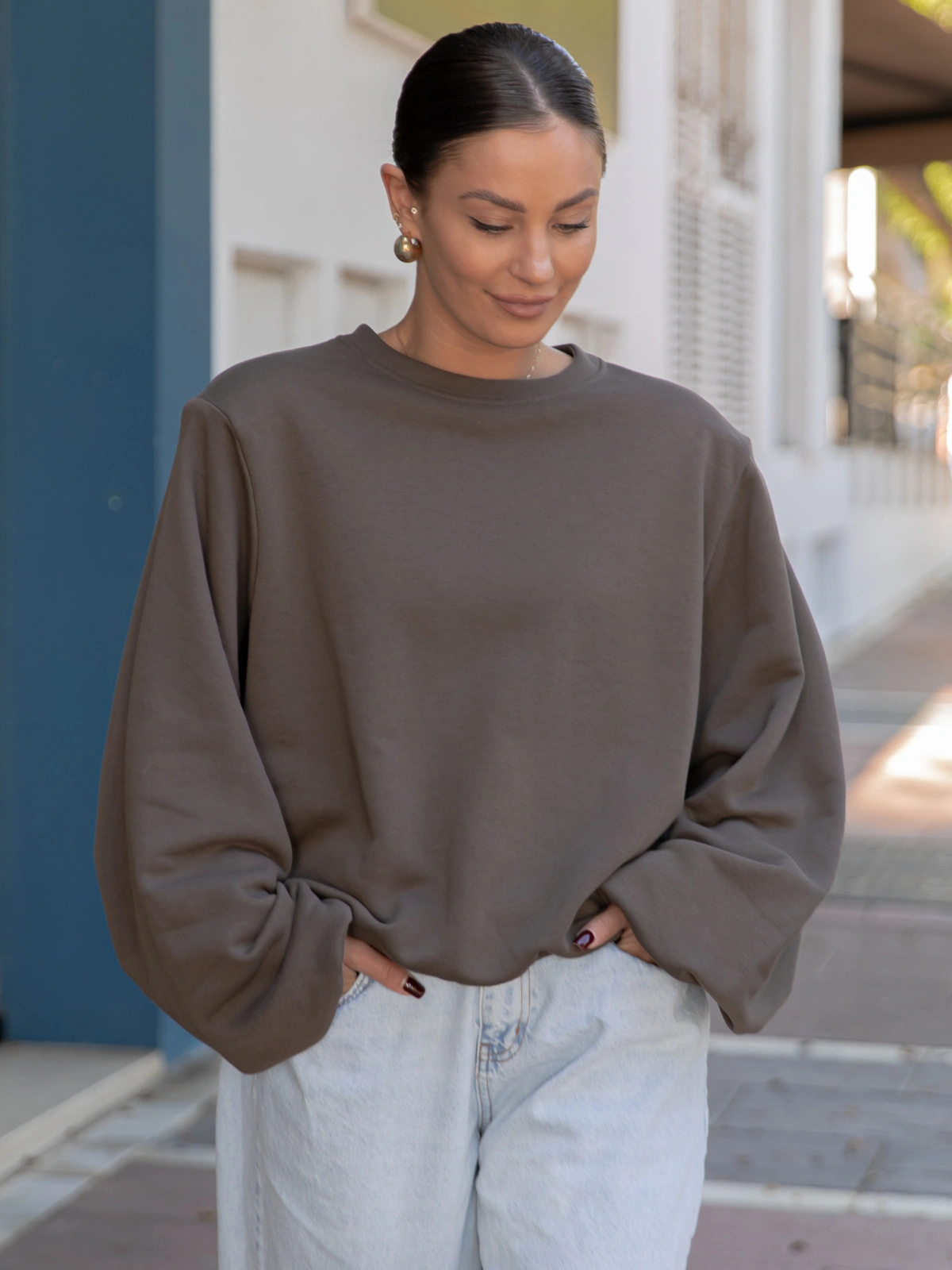 Oversizowa bawełniana BLUZA z drapanego dresu z poduszkami na ramionach dark mokka X469 k01