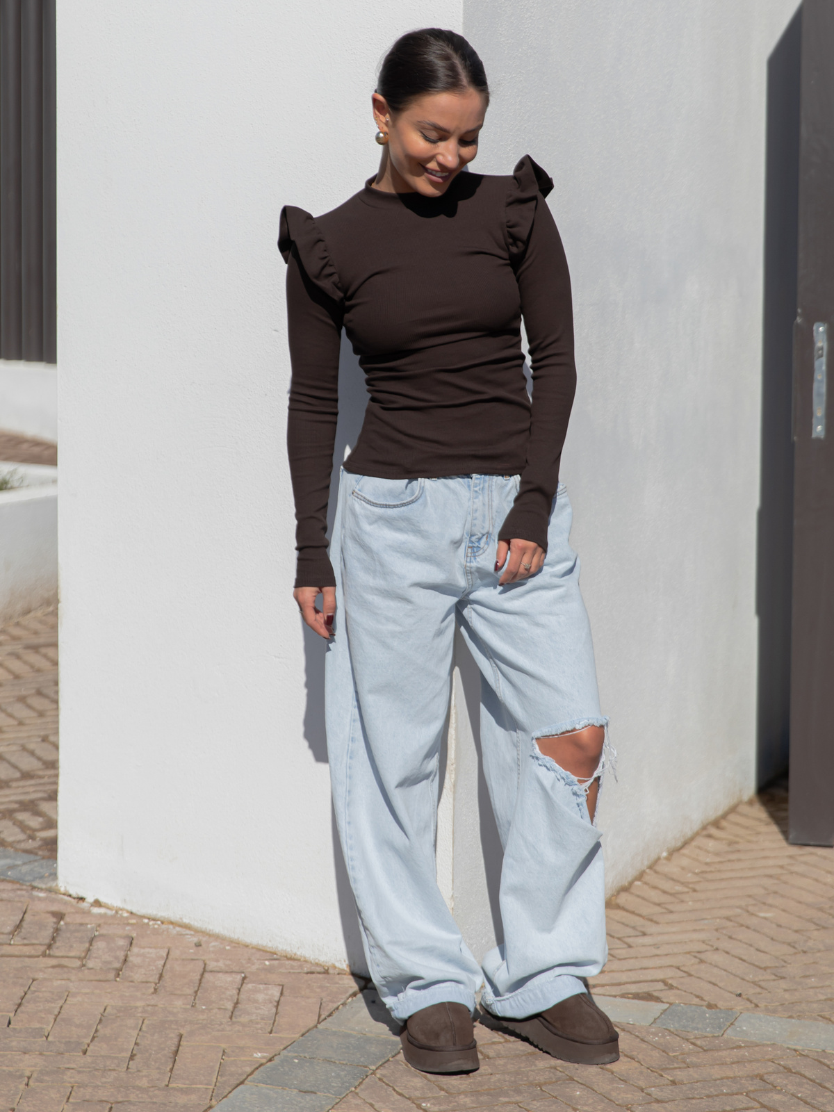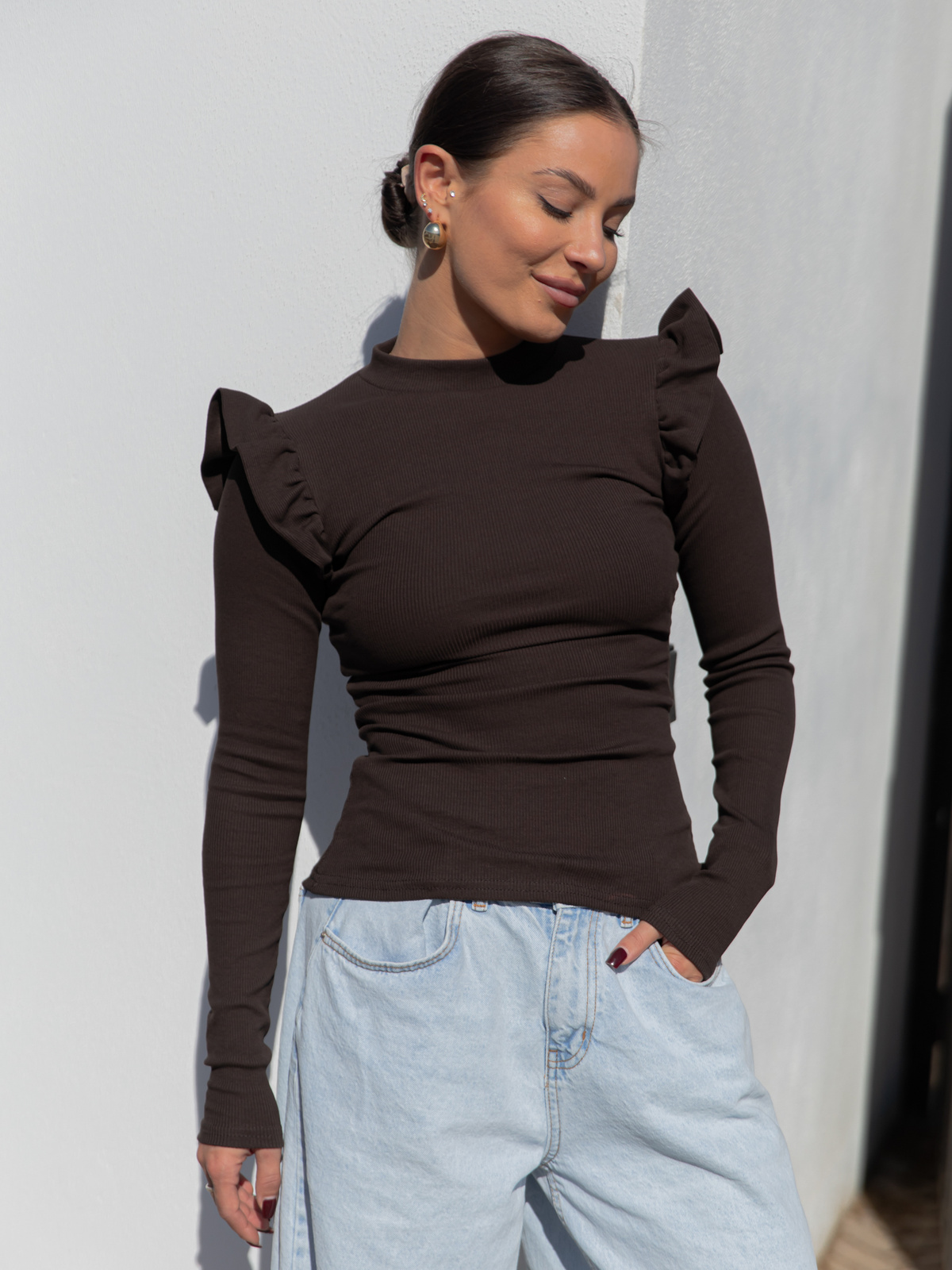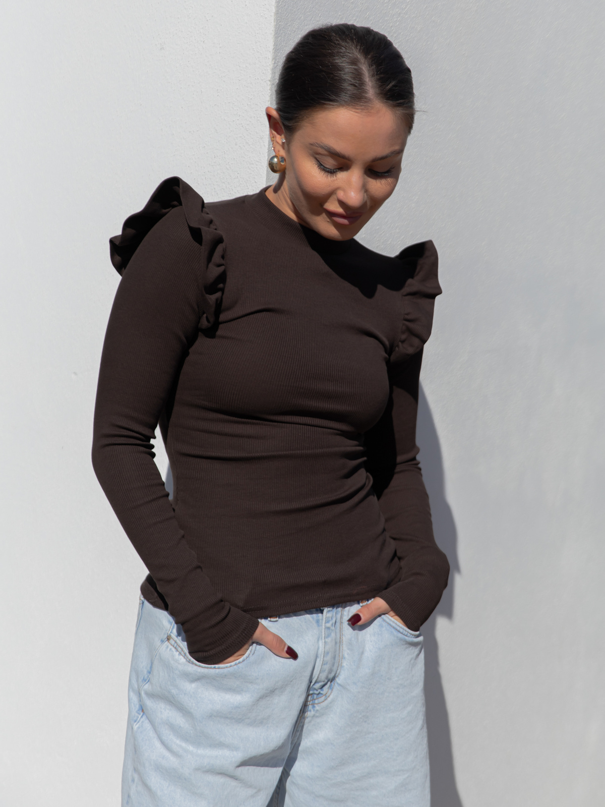 Bawełniana dopasowana BLUZKA z dzianiny prążkowanej z falbankami na ramionach czekoladowa X470