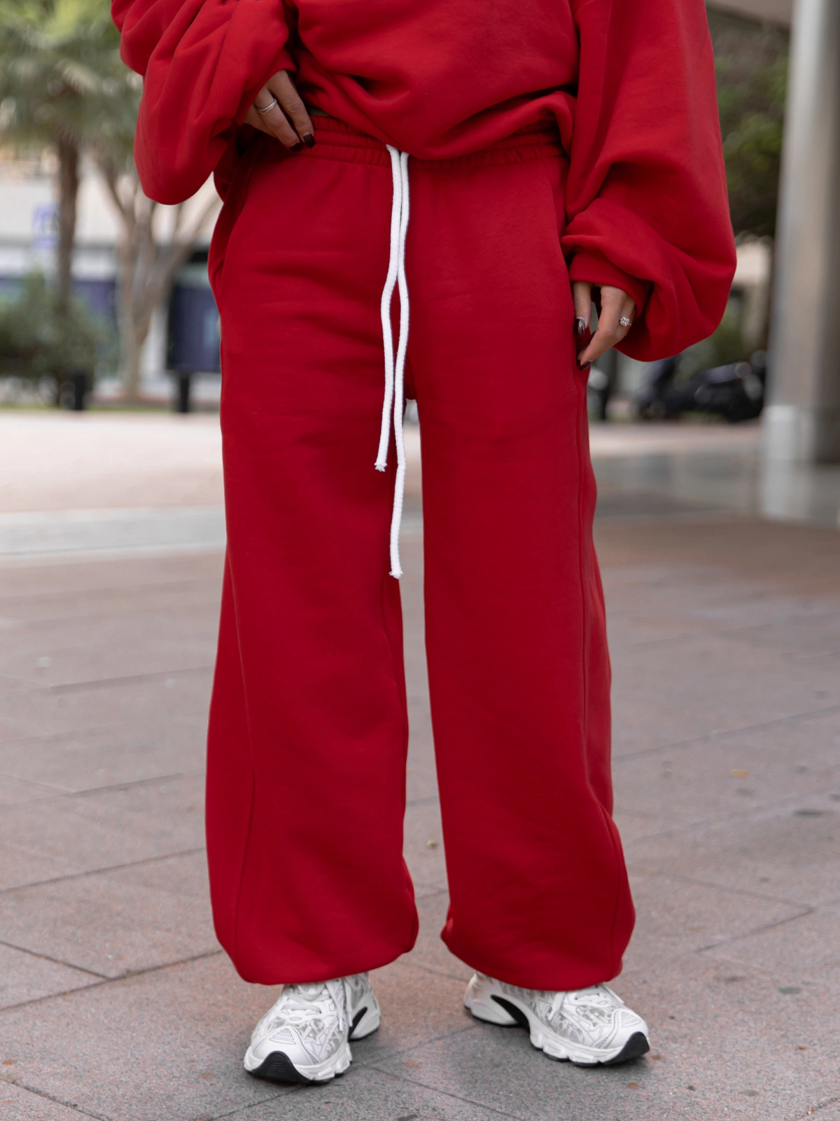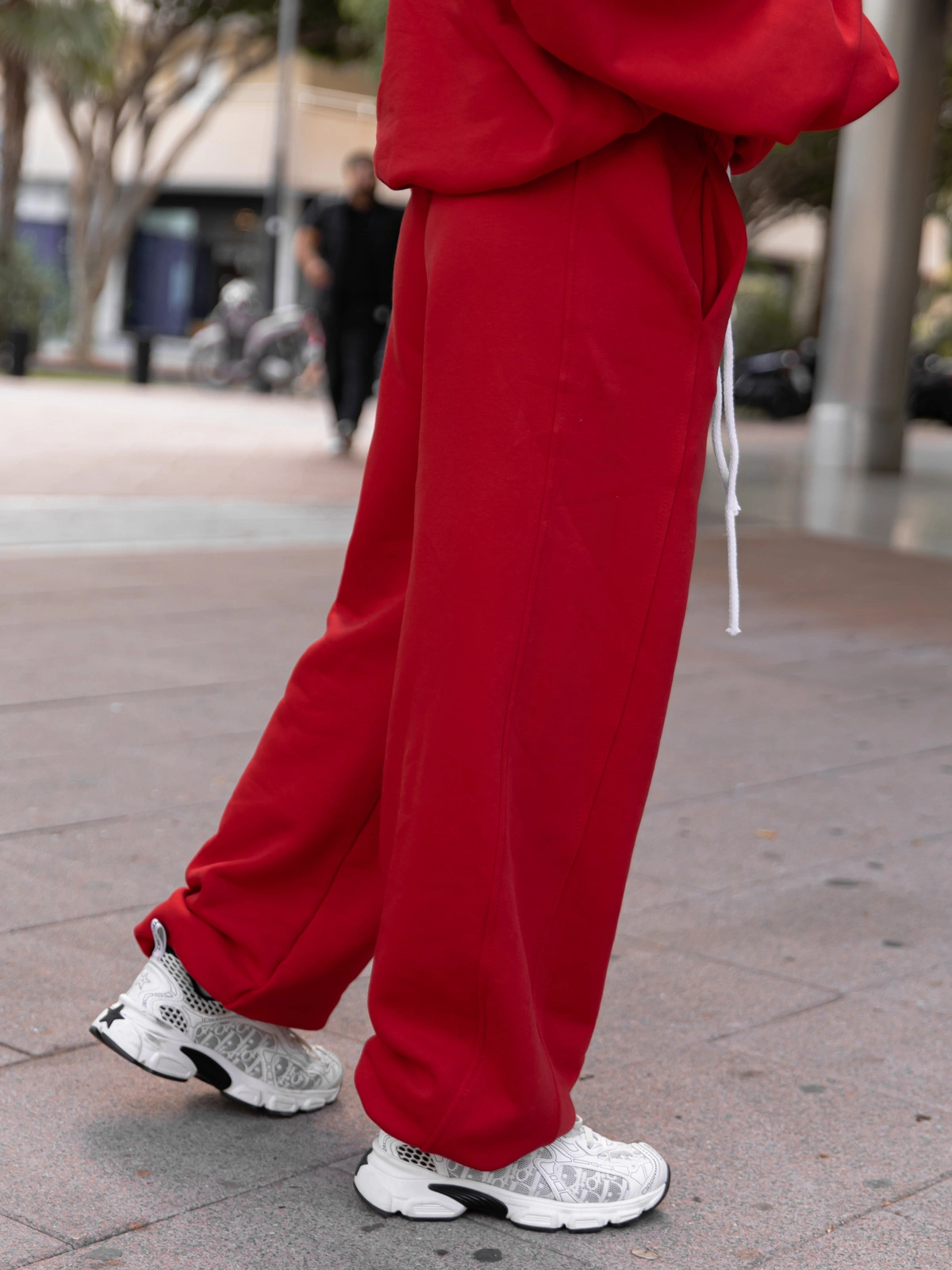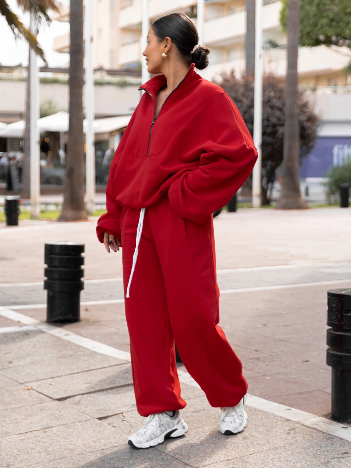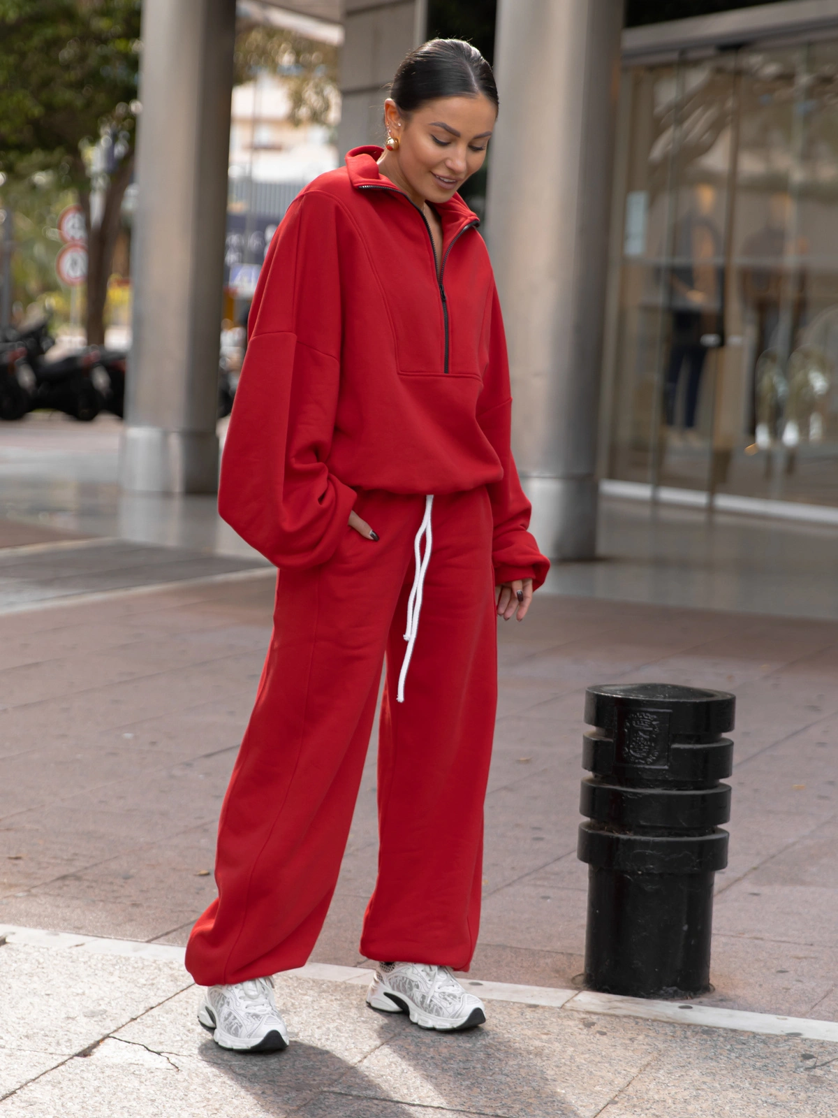 Oversizowe bawełniane SPODNIE dresu drapanego z przeszyciem i ściągaczami czerwone X476