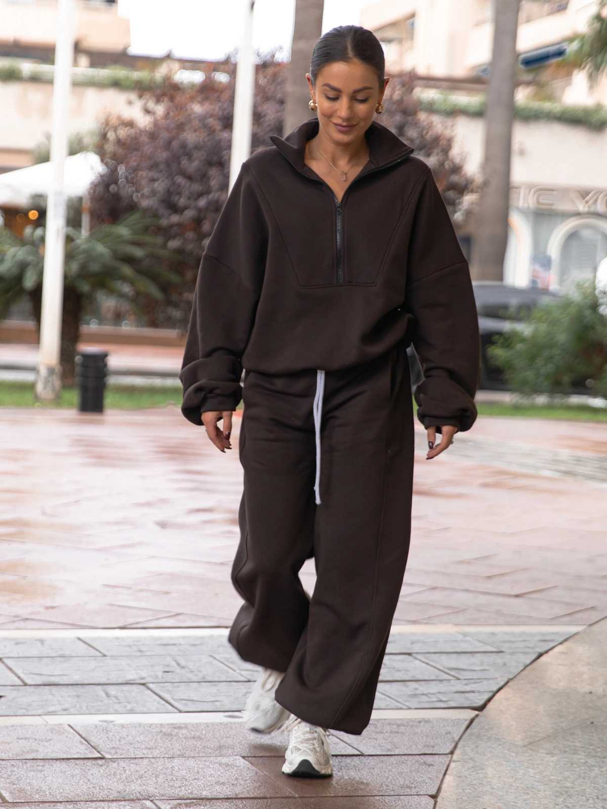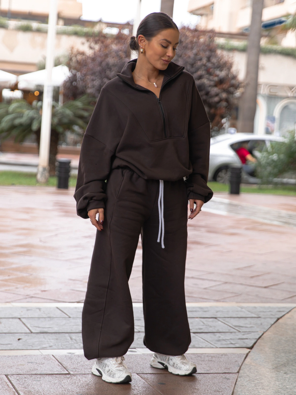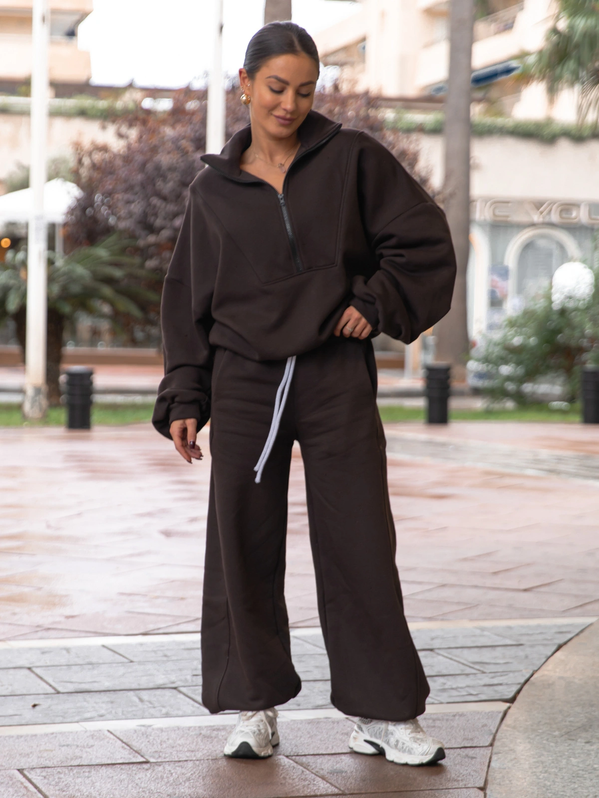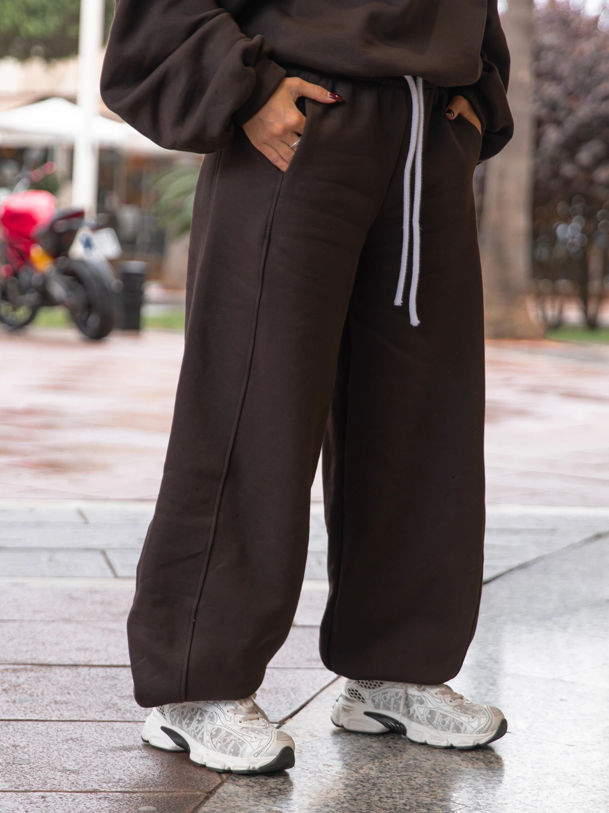Oversizowe bawełniane SPODNIE dresu drapanego z przeszyciem i ściągaczami dark chocolate X476