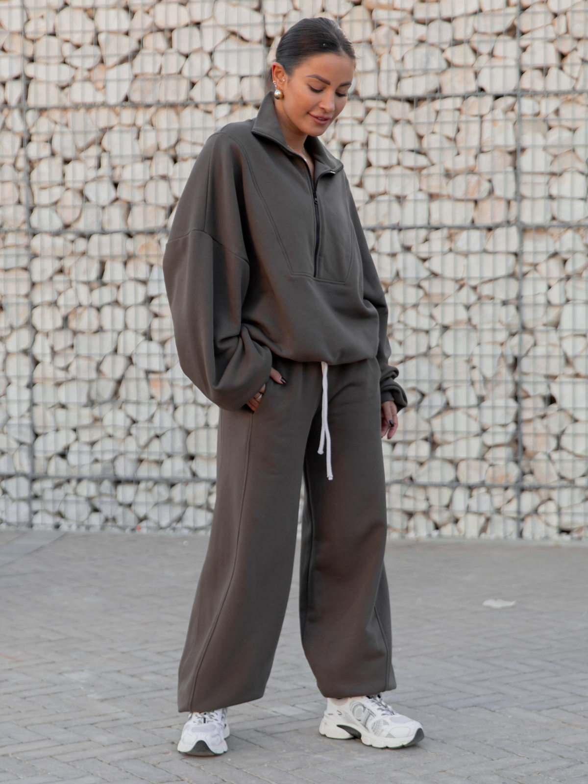 Oversizowe bawełniane SPODNIE dresu drapanego z przeszyciem i ściągaczami dark mokka X476