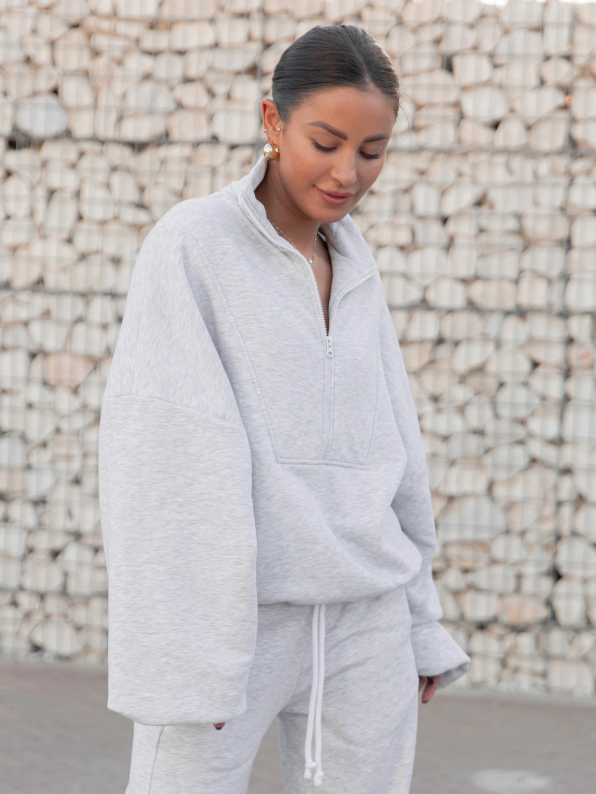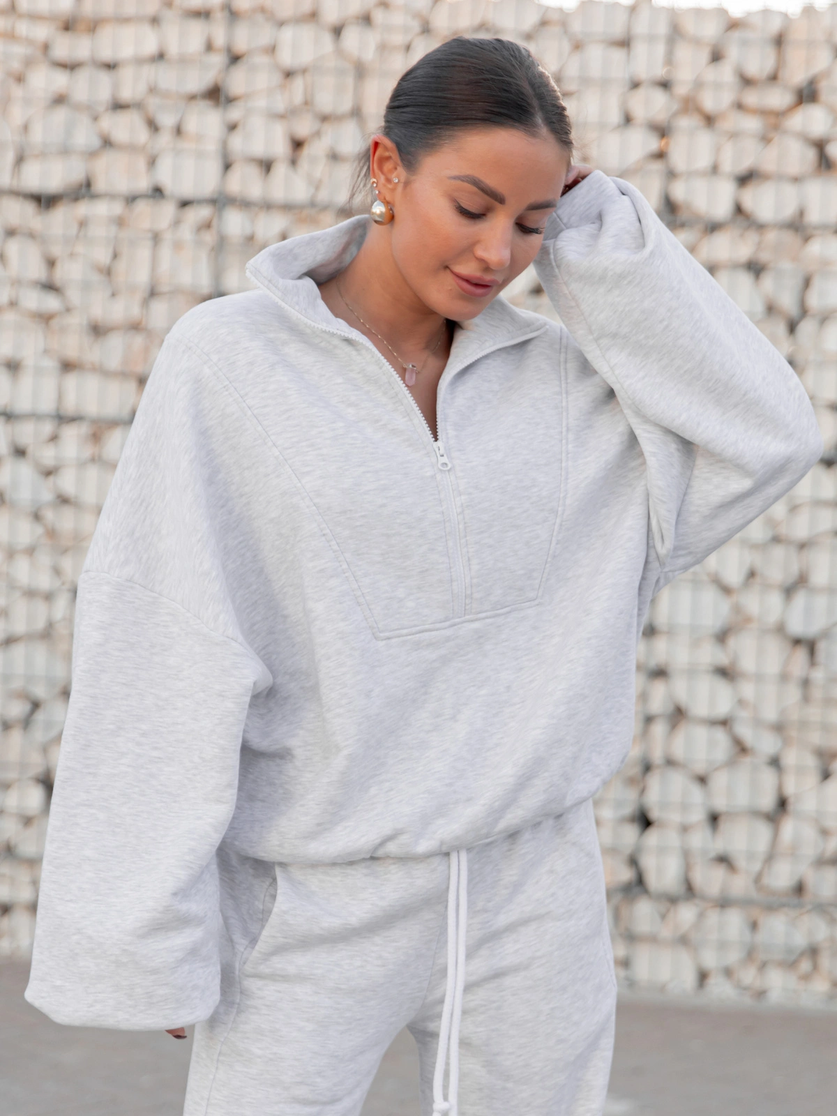 Oversizowa bawełniana BLUZA z dresu drapanego na stójce z zamkiem szary melanż X477