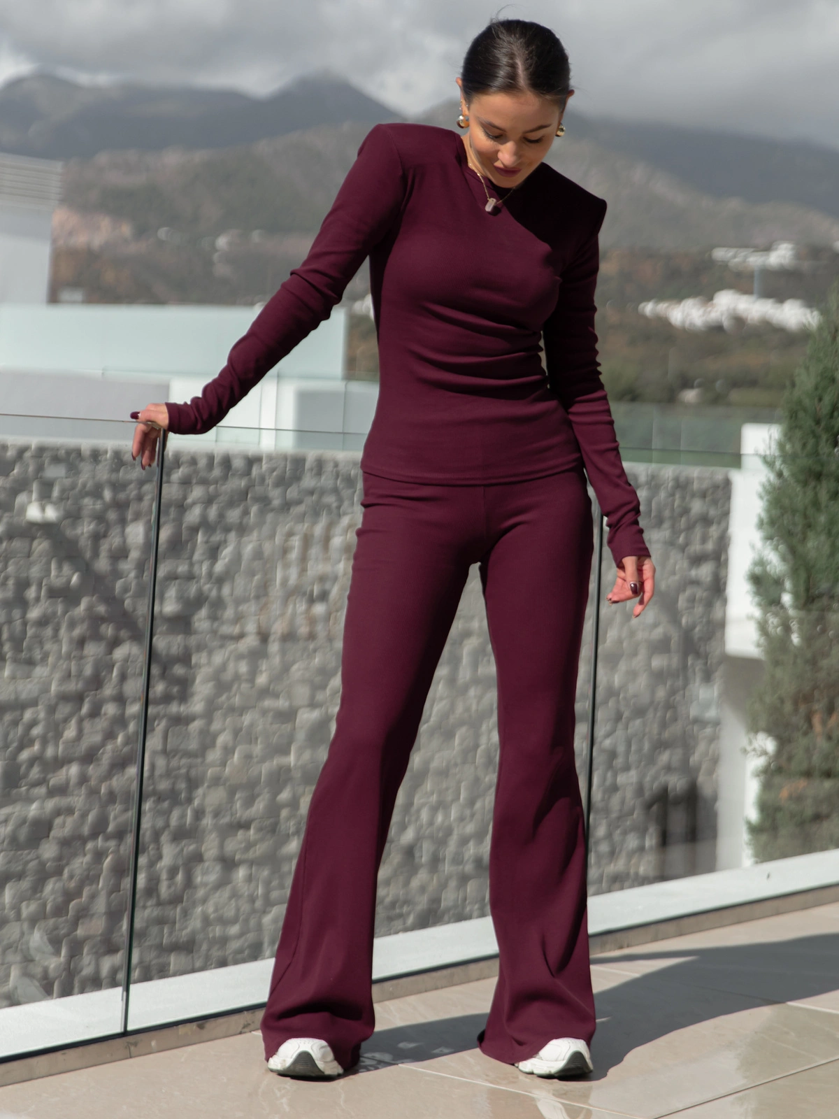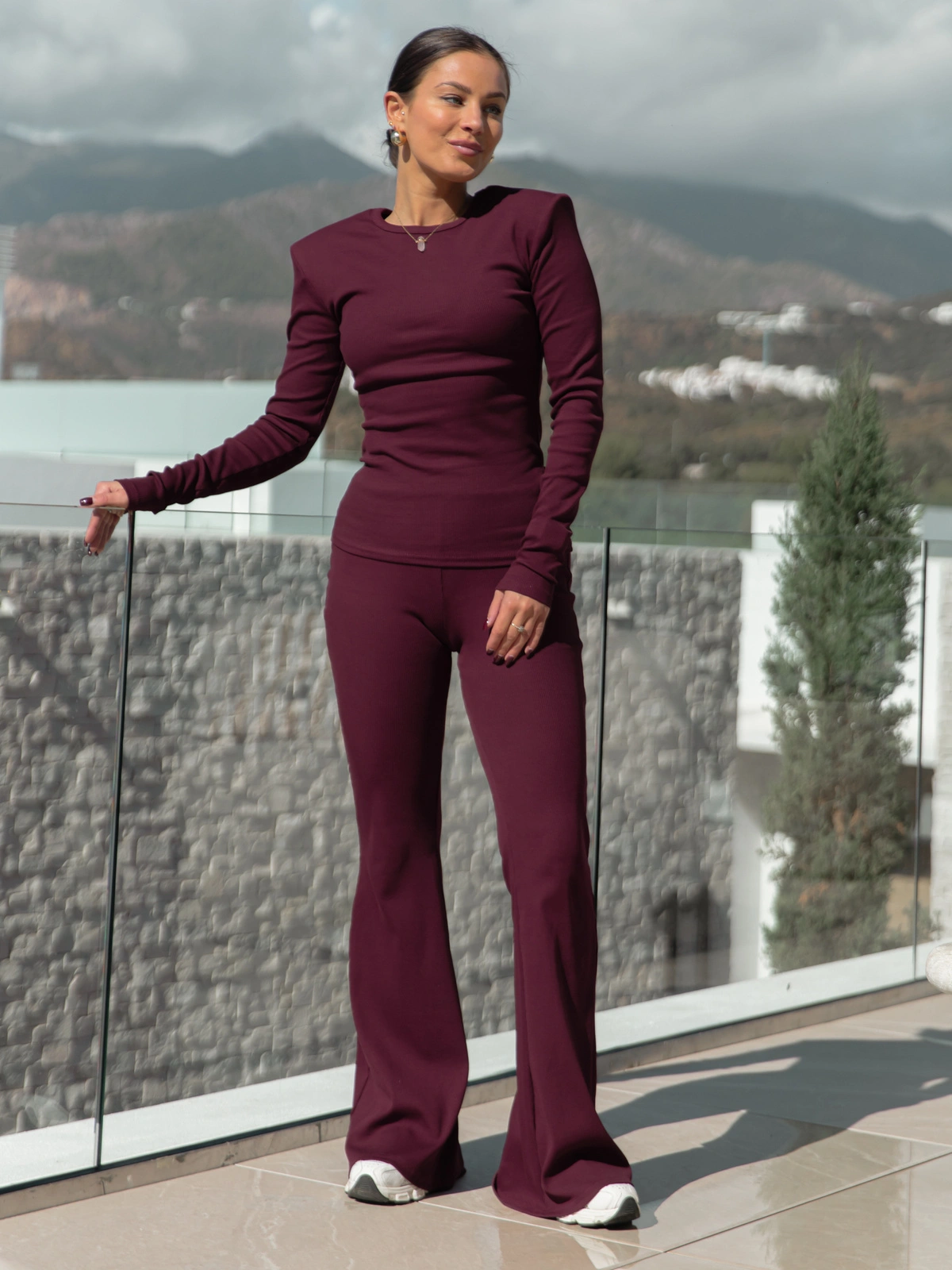ZESTAW: Basicowa BLUZKA z dzianiny prążkowanej z poduszkami na ramionach X465 + Dopasowane SPODNIE z szerokimi nogawkami z dzianiny prążkowanej X466