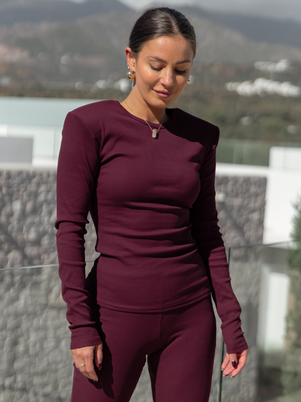 Bawełniana basicowa BLUZKA z dzianiny prążkowanej z poduszkami na ramionach śliwkowa X465 (1 szt.)