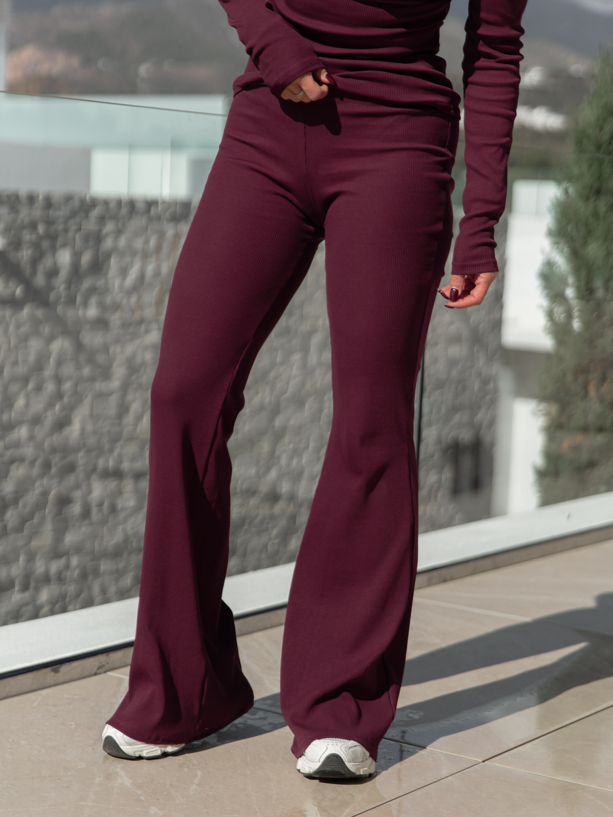 Bawełniane dopasowane SPODNIE z szerokimi nogawkami z dzianiny prążkowanej śliwkowe X466 (1 szt.)