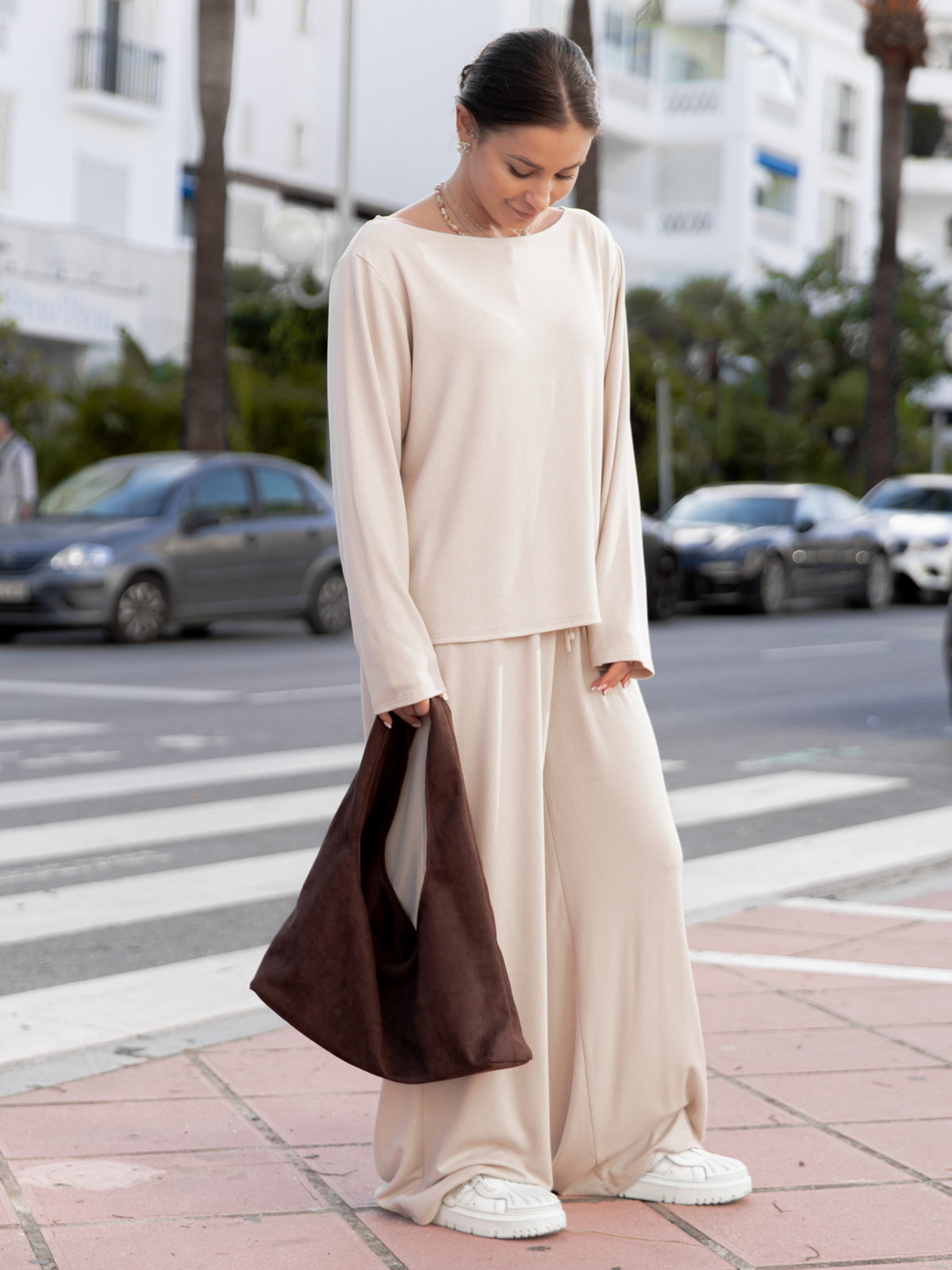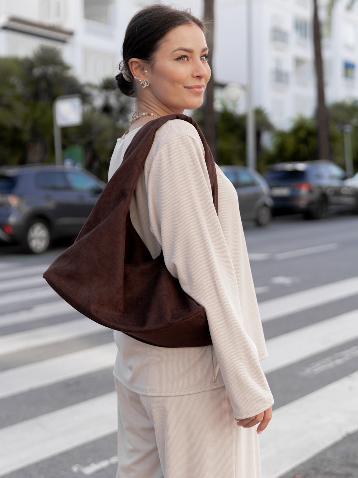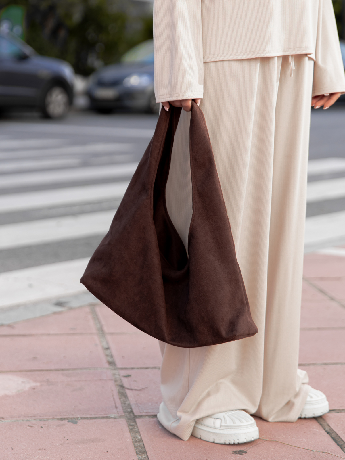 Stylowa codzienna torebka na ramię , uszyta z podwójnej warstwy materiału , z usztywnianym dnem , bez zapięcia . Uszyta z zamszu .