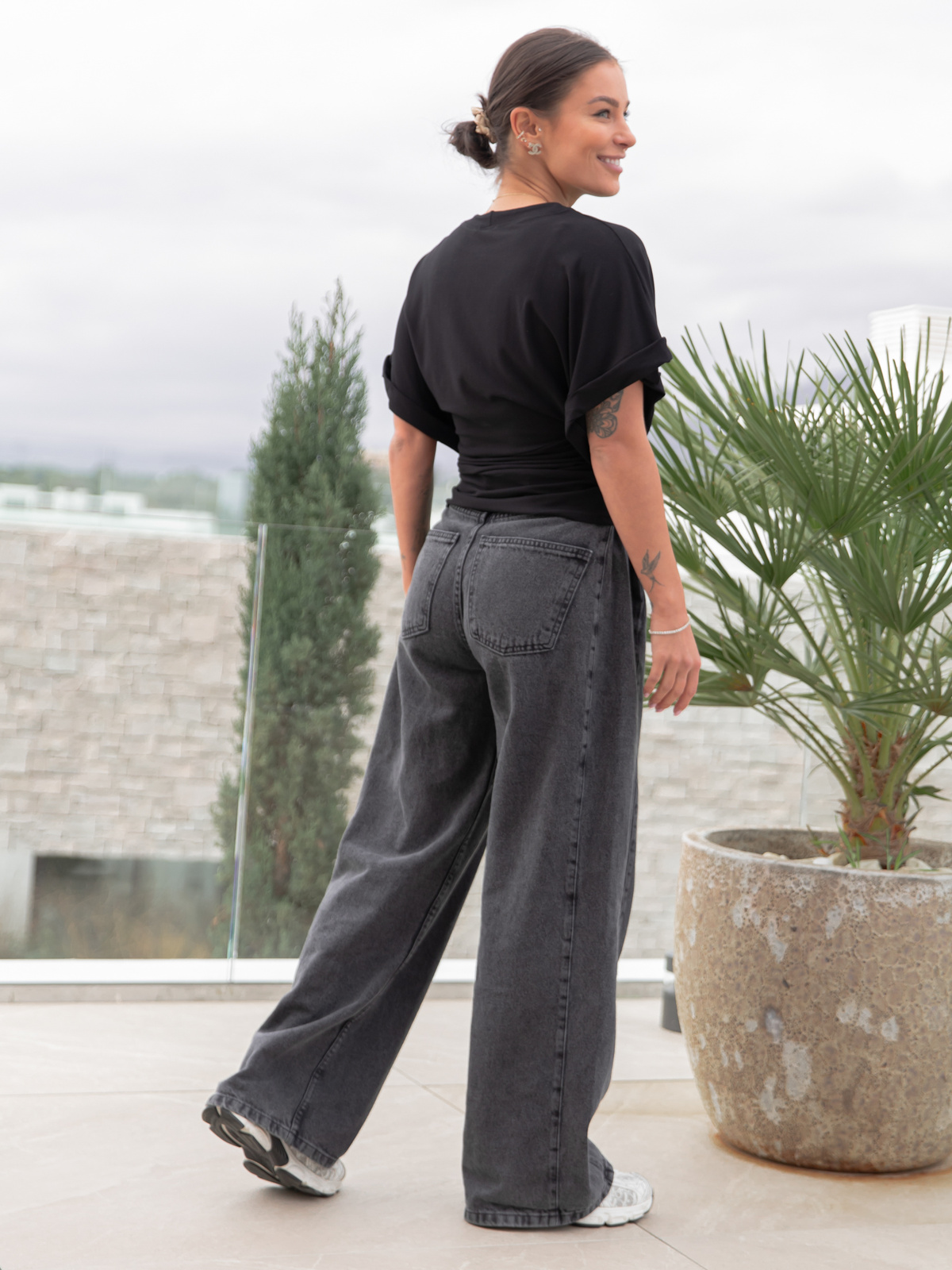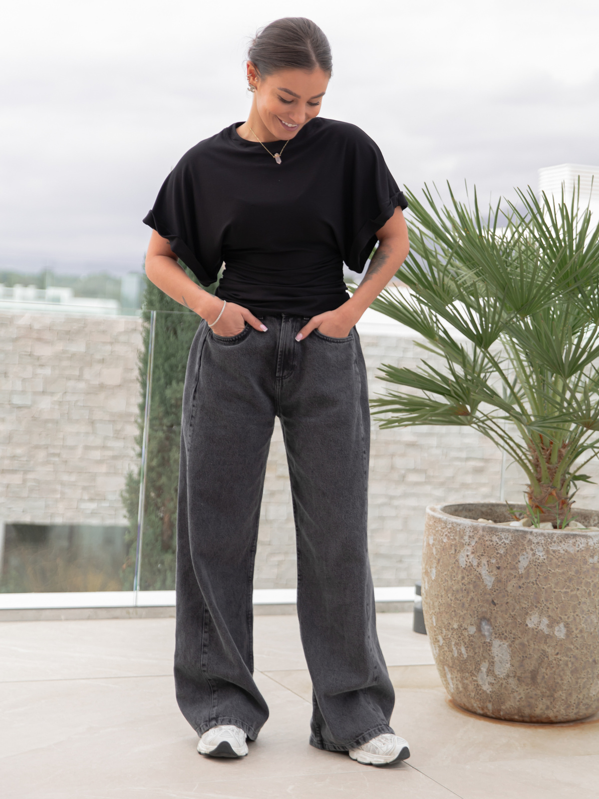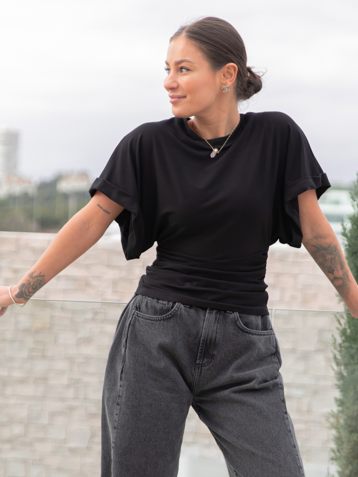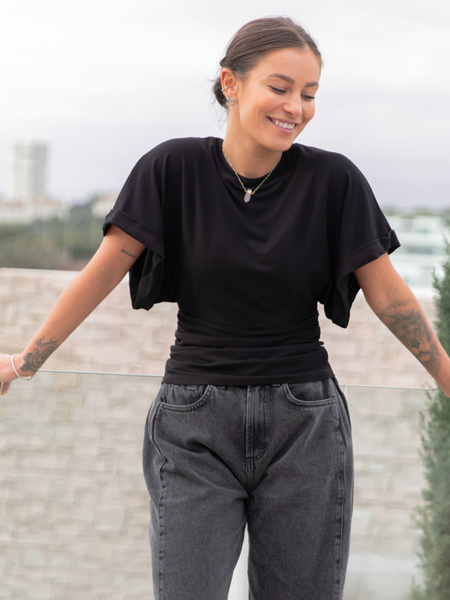 Bluzka z krótkim kimonowym rękawem , góra bluzka lużna , dół dopasowany , drapowana po bokach . Uszyta z miękkiej i elastycznej dzianiny wiscozowej od polskiego producenta .