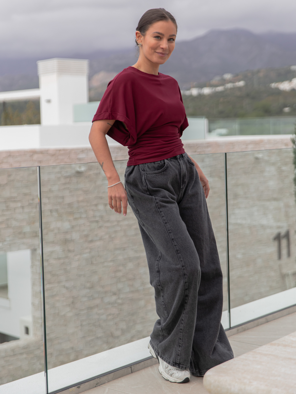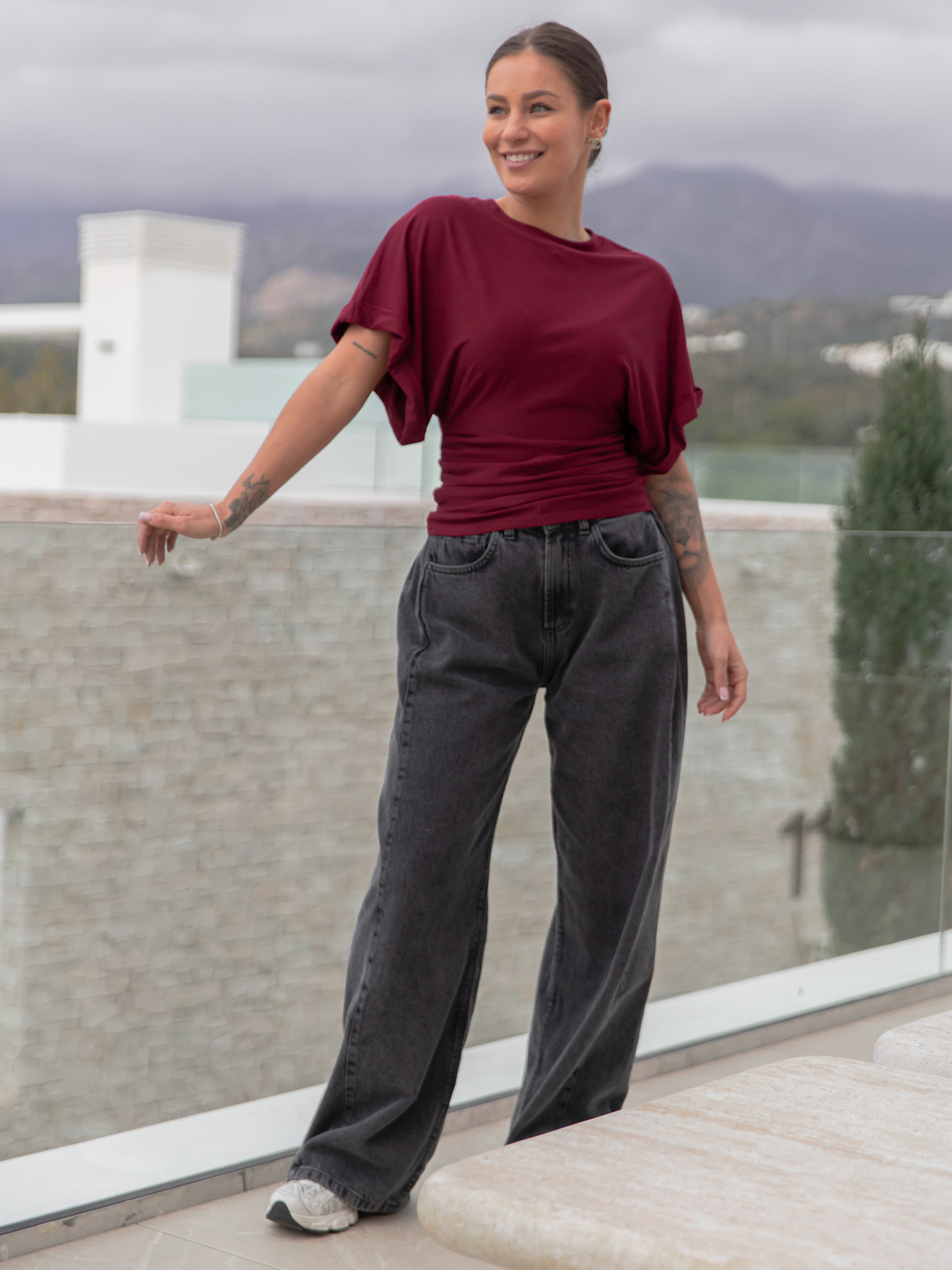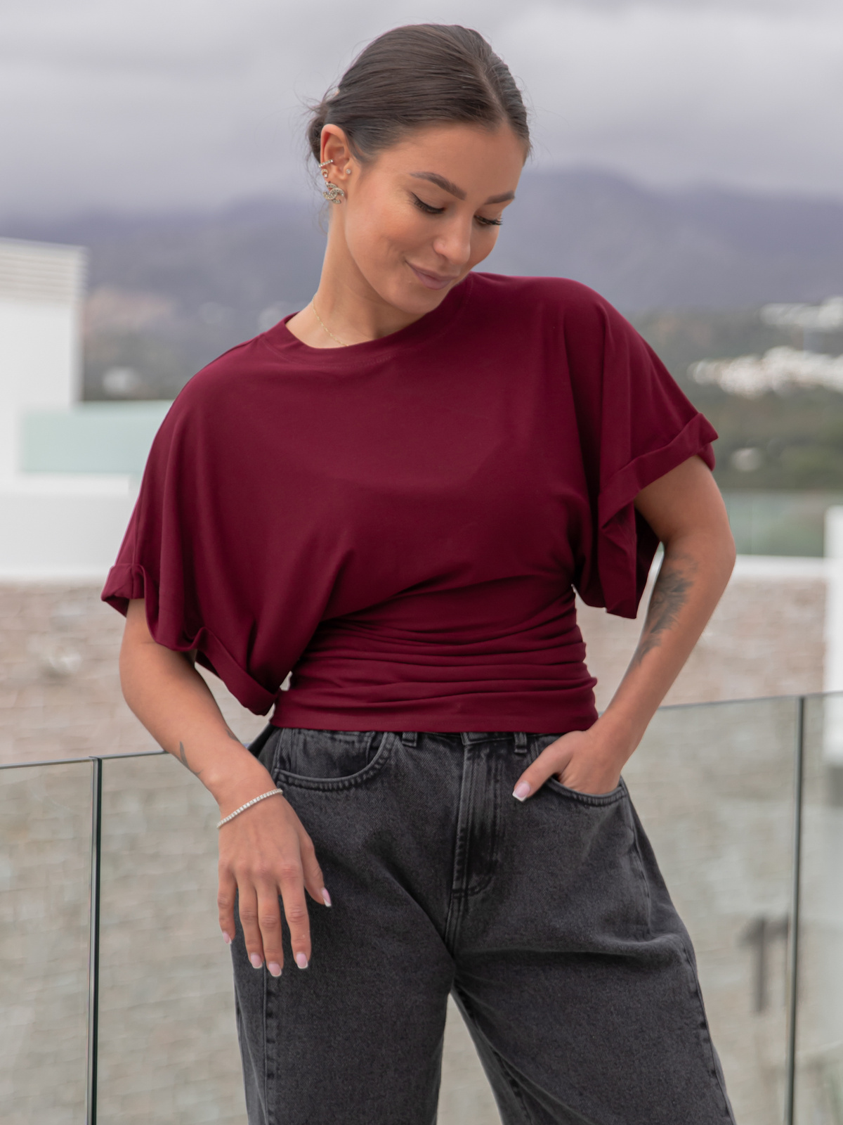 Wiskozowa BLUZKA kimono z marszczeniem po bokach z krótkim rękawem bordowa X501