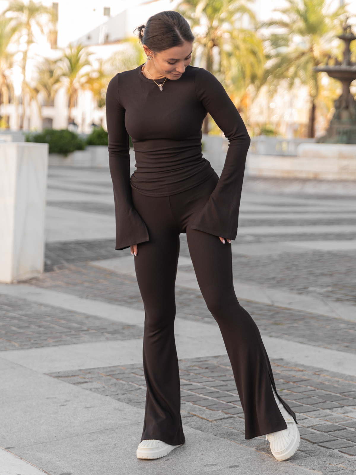 • Komplet: krótka bluzka z długim, rozszerzanym rękawem i subtelnym rozcięciem u dołu, oraz dopasowane spodnie z wysokim stanem i lekko rozszerzanymi nogawkami.