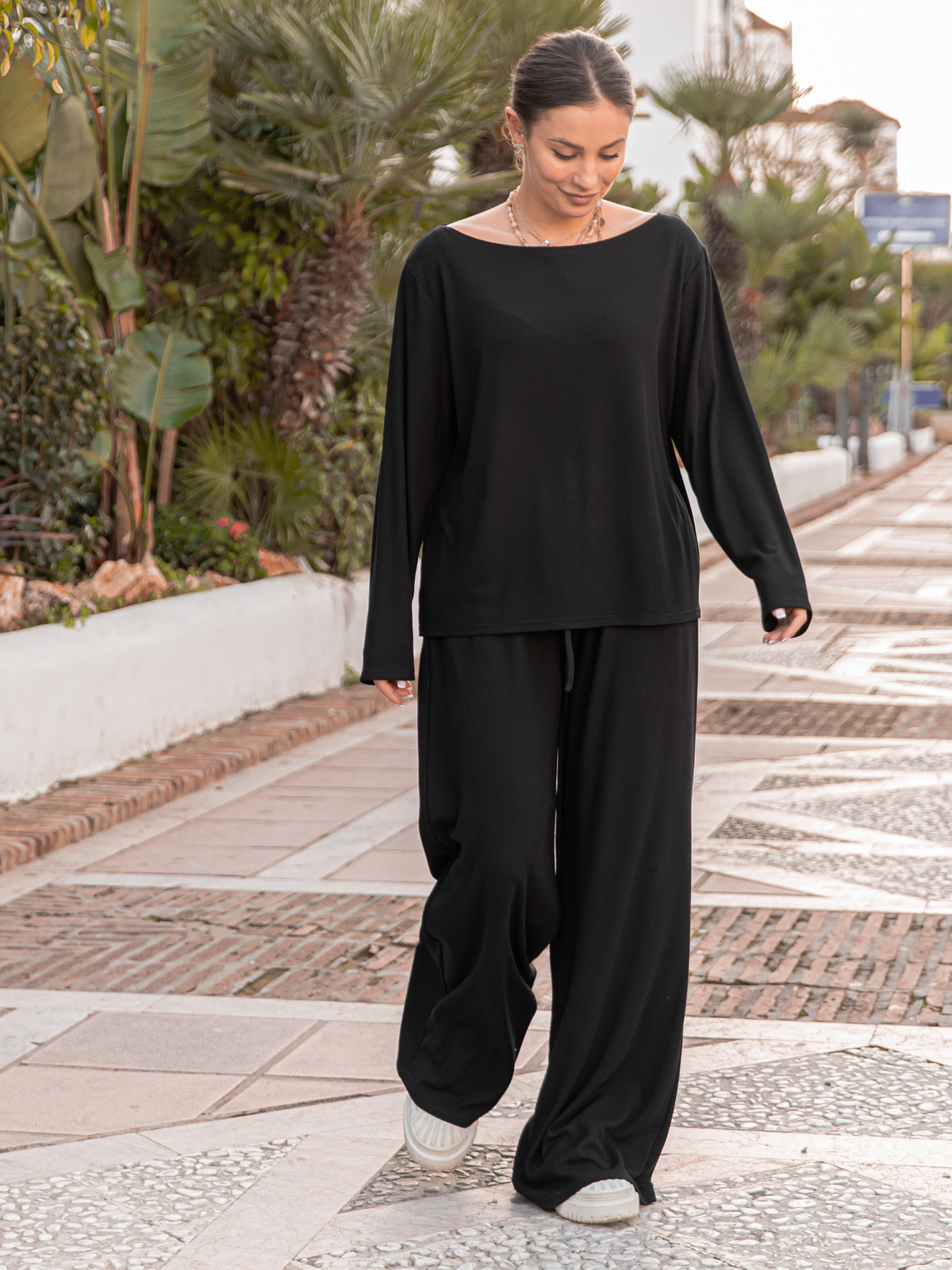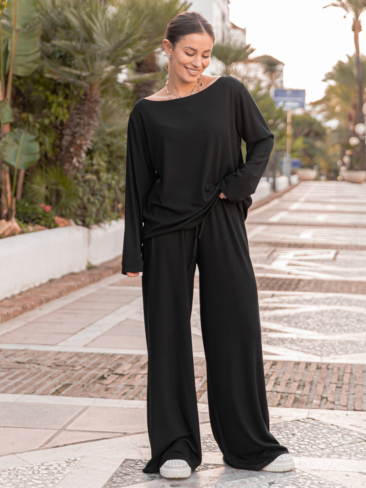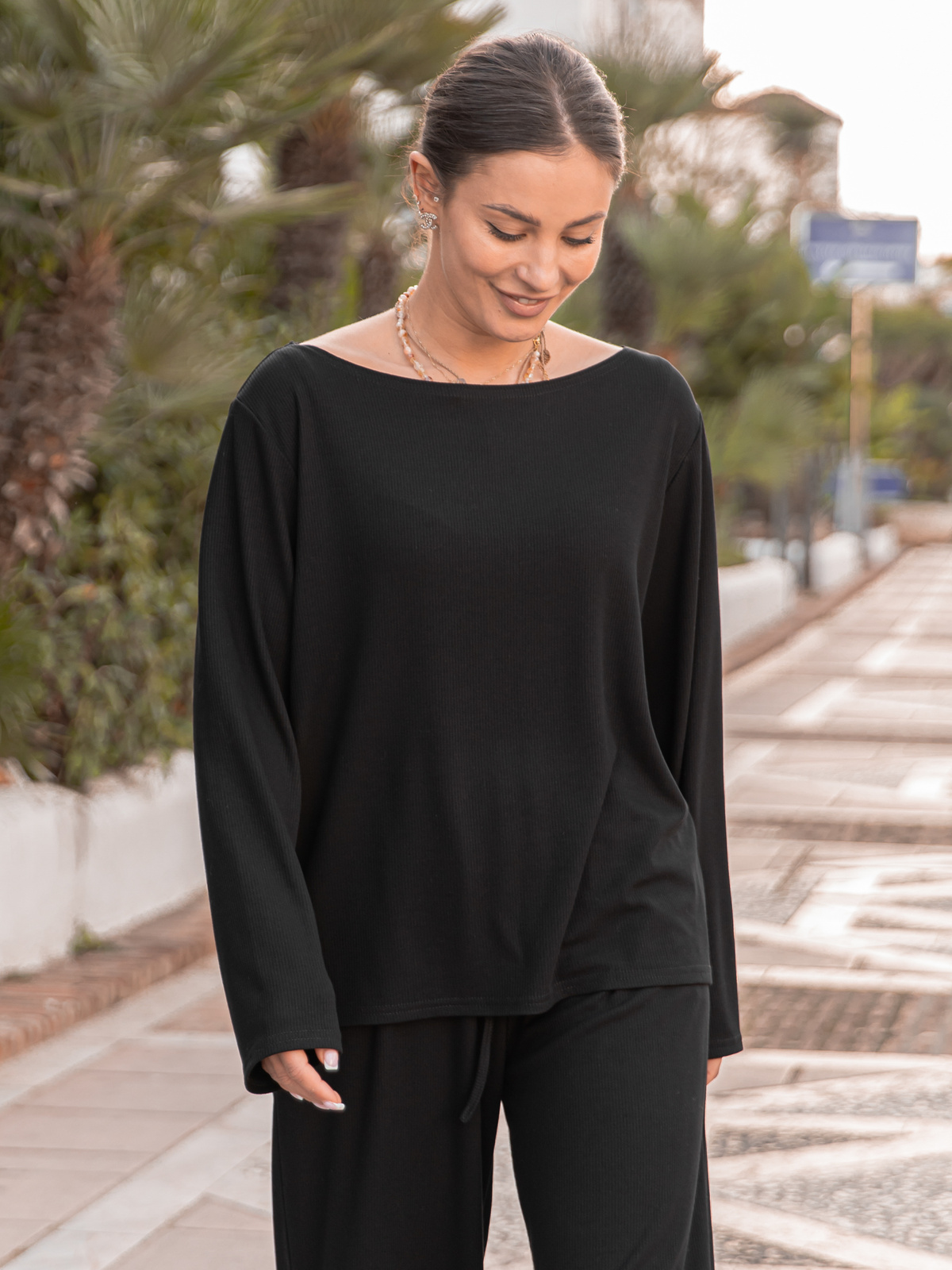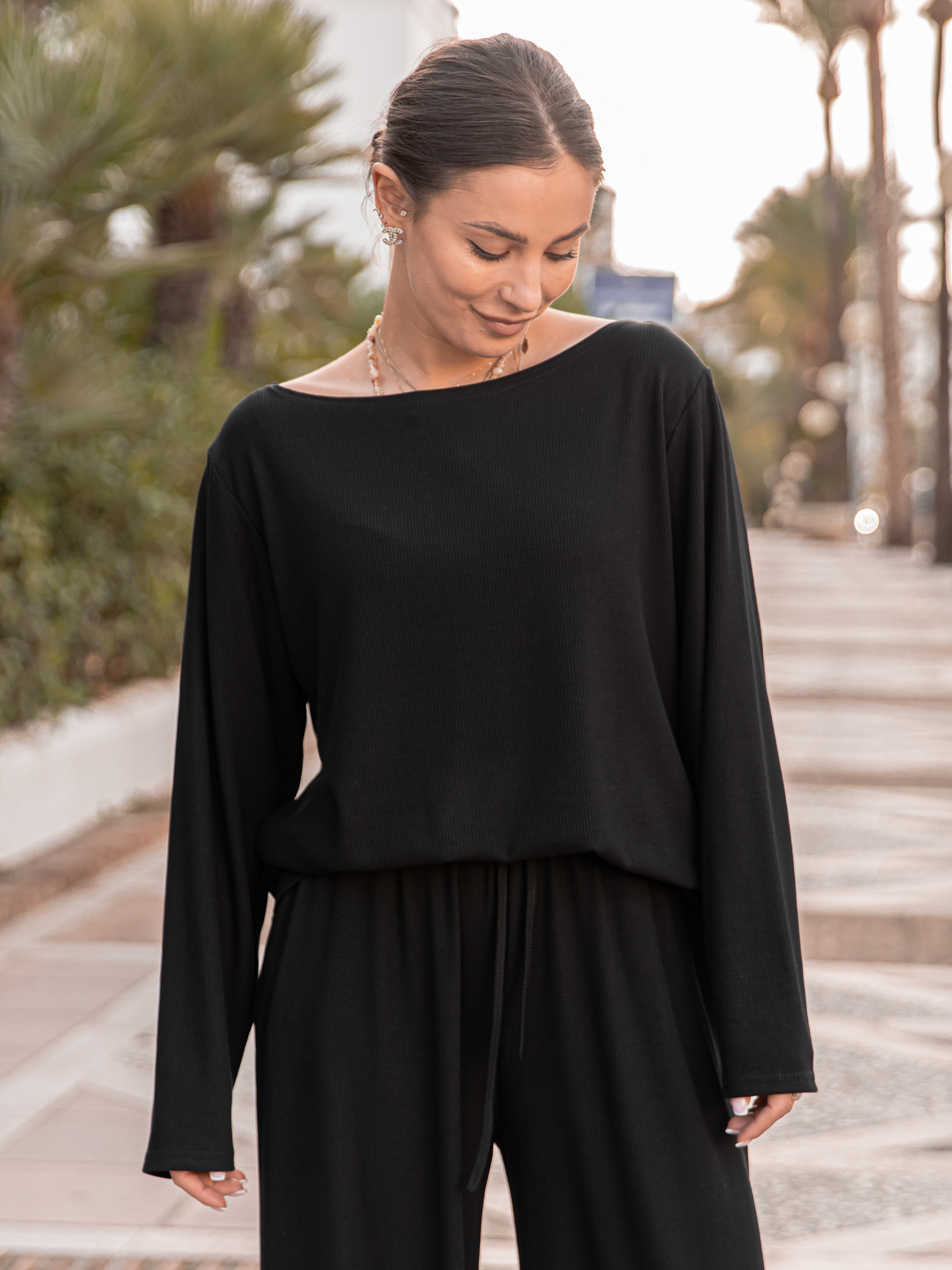 Luźna komfortowa BLUZKA z długim rękawem z prążkowanej dzianiny wiskoza i bawełna czarna X506