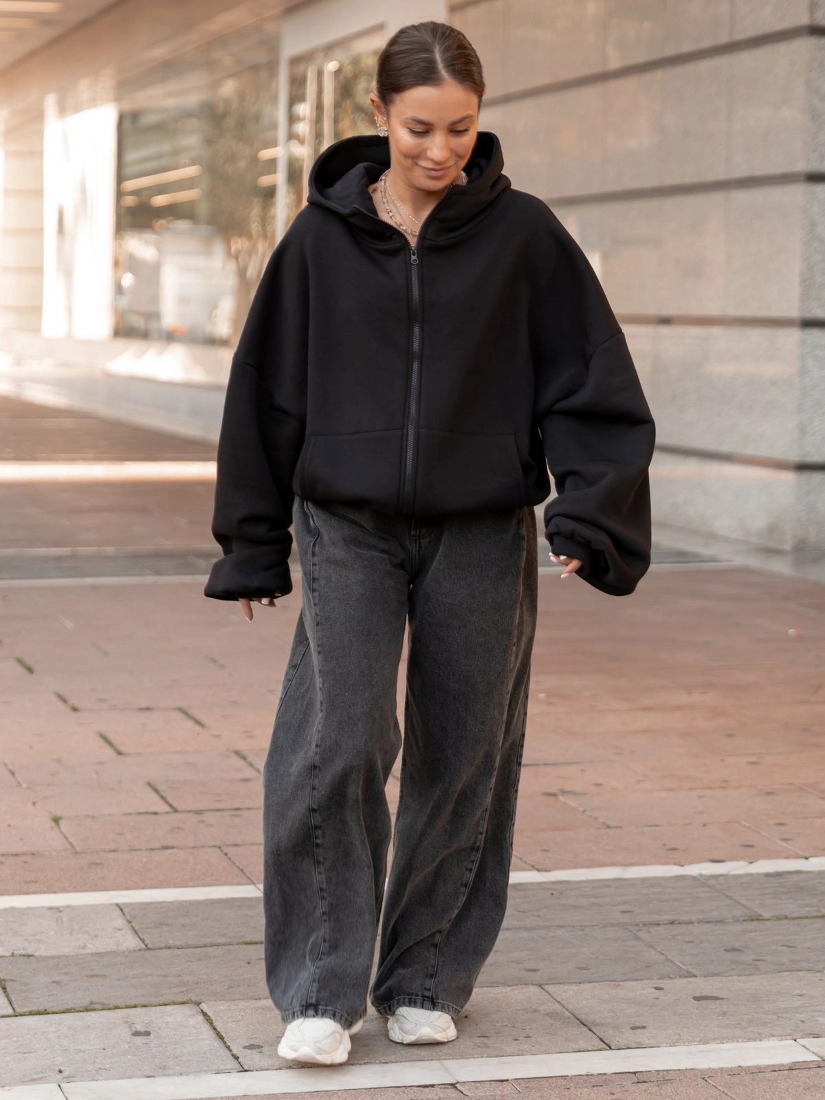 Szeroka, luźna bluza z kapturem i kołnierzem, zapinana na zamek. Ściągacze na mankietach i u dołu bluzy zapewniają wygodne dopasowanie i komfort noszenia. W naszej ofercie dostępne są również spodnie dresowe w różnych fasonach, idealne do kompletowania stylizacji.