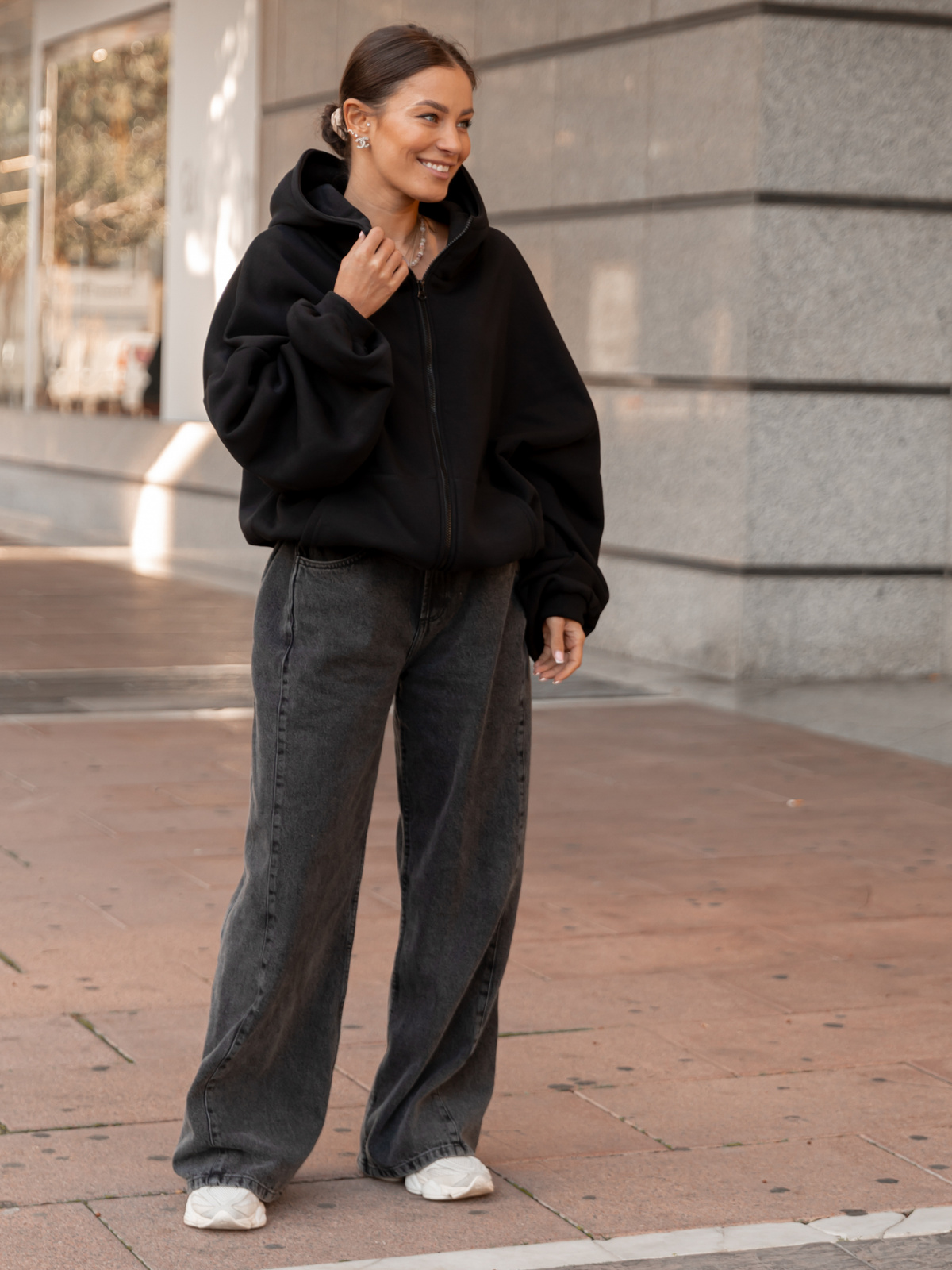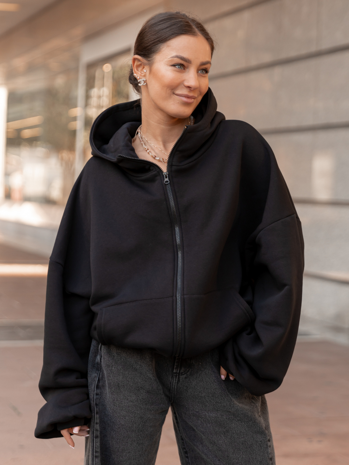 Bawełniana oversizowa BLUZA z kapturem zapinana na zamek z dresu drapanego czarna X508