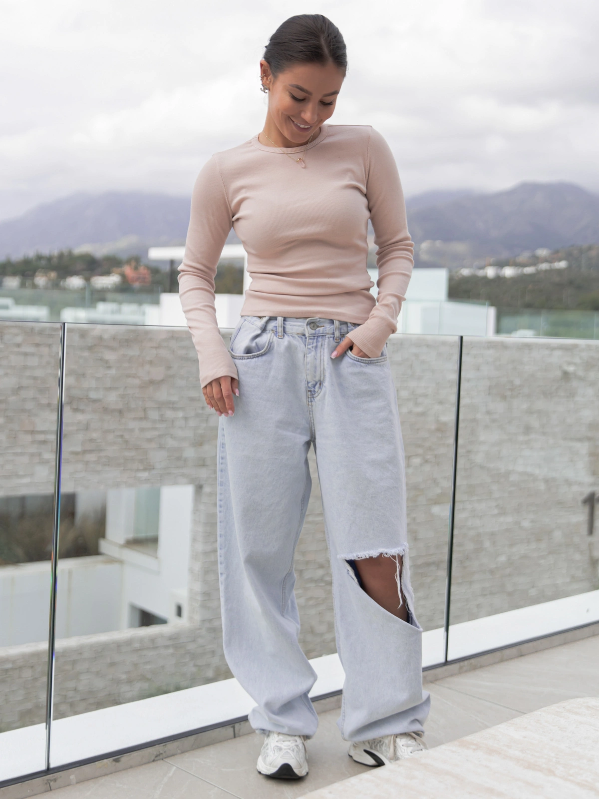 Bawełniana basicowa BLUZKA z prążkowanej dzianiny beżowa X513