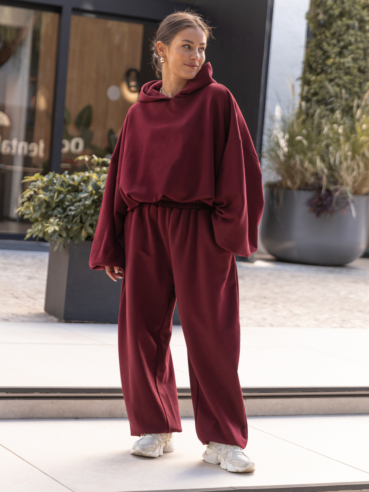 Bawełniana dresowa BLUZA z kapturem oversize z szerokimi rękawami z dresu pętelkowego bordowa X515