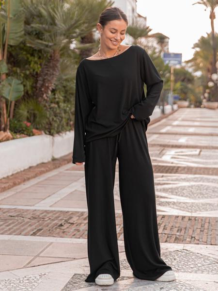 • Komfortowy zestaw składający się z oversizowej bluzki oraz luźnych spodni.