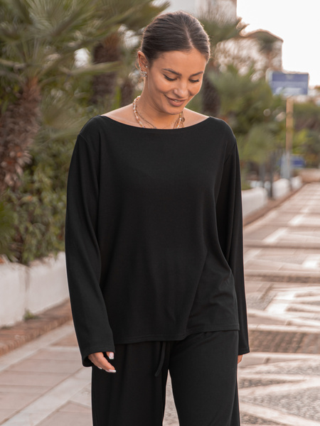 Luźna komfortowa BLUZKA z długim rękawem z prążkowanej dzianiny wiskoza i bawełna czarna X506 (1 szt.)