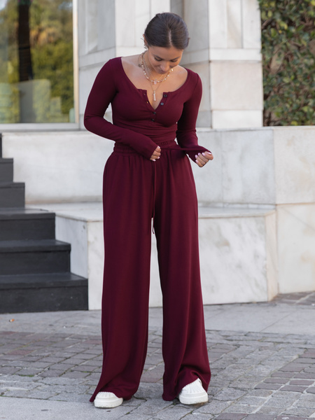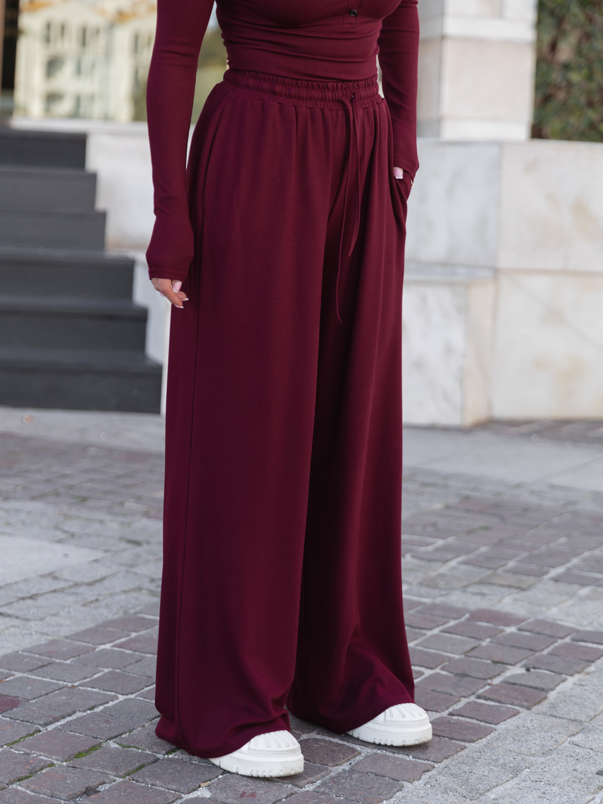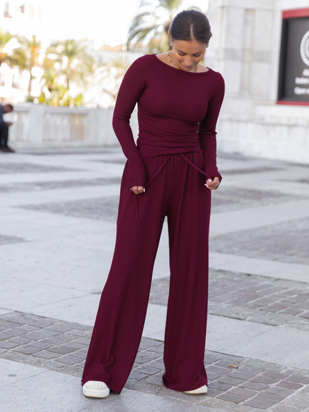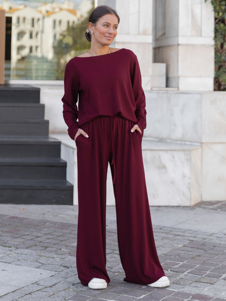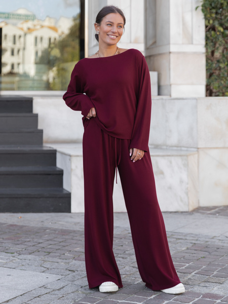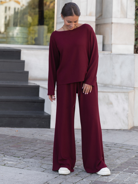 Luźne komfortowe SPODNIE z prążkowanej dzianiny wiscoza i bawełna bordowe X507 (1 szt.)