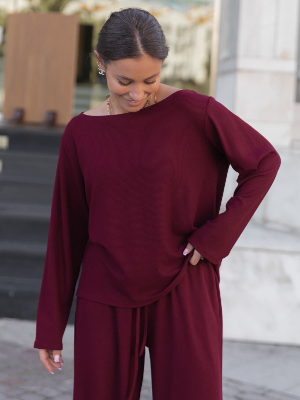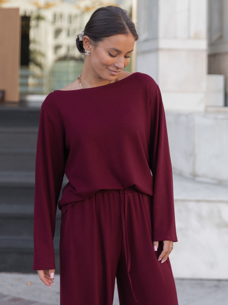 Luźna komfortowa BLUZKA z długim rękawem z prążkowanej dzianiny wiskoza i bawełna bordowa X506 (1 szt.)