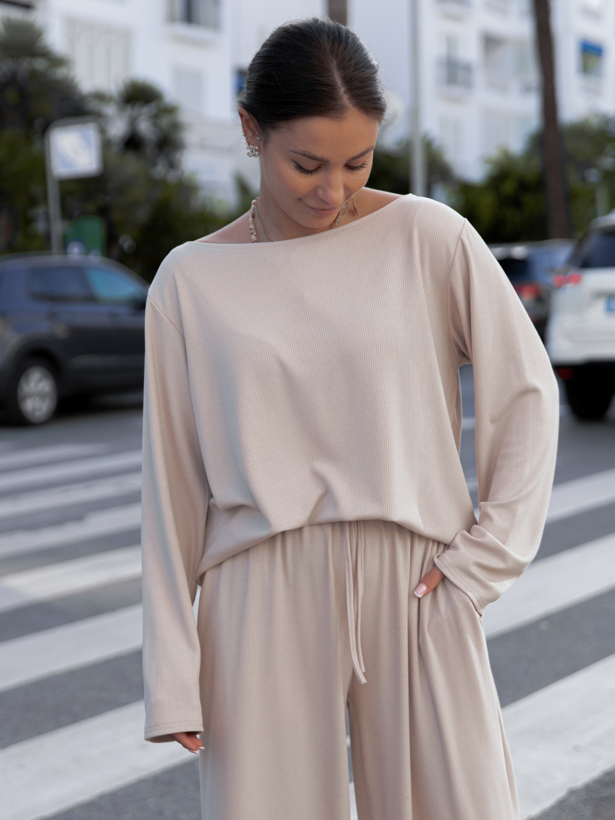 ZESTAW z prążkowanej dzianiny: Luźne SPODNIE X507 + Luźna BLUZKA z długim rękawem X506