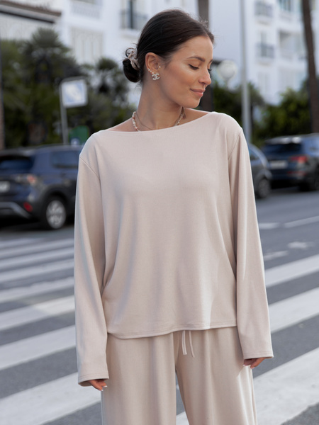 Luźna komfortowa BLUZKA z długim rękawem z prążkowanej dzianiny wiskoza i bawełna beżowa X506 (1 szt.)