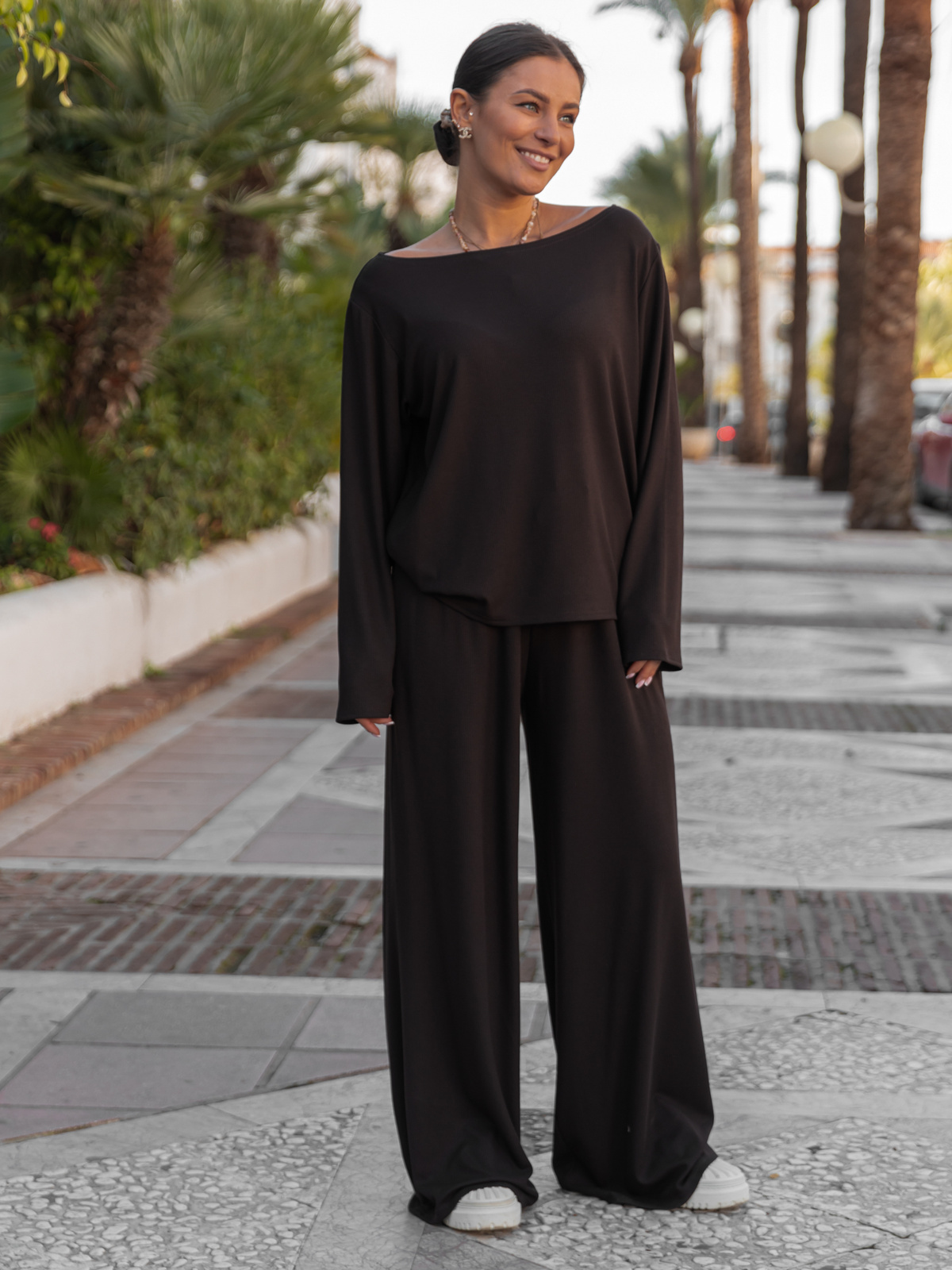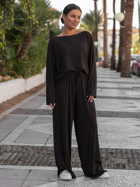 • Komfortowy zestaw składający się z oversizowej bluzki oraz luźnych spodni.