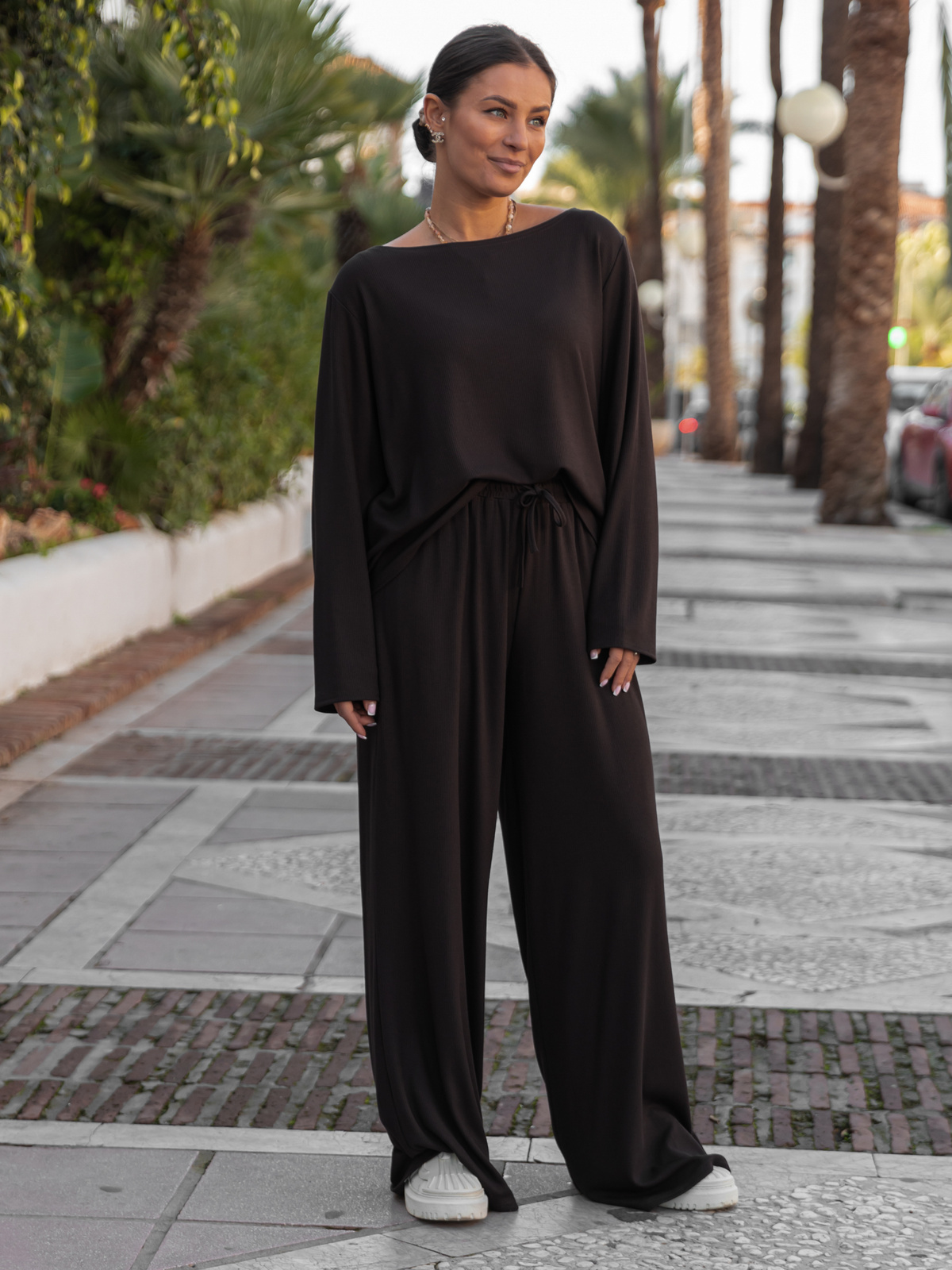 Luźne komfortowe SPODNIE z prążkowanej dzianiny wiscoza i bawełna czekoladowe X507 (1 szt.)