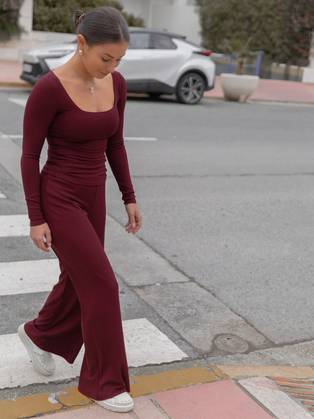 Codzienny KOMPLET bluzka z kwadratowym dekoltem i dopasowane spodnie z szerokimi nogawkami z prążkowanej dzianiny wiscoza i bawełna bordowy X551