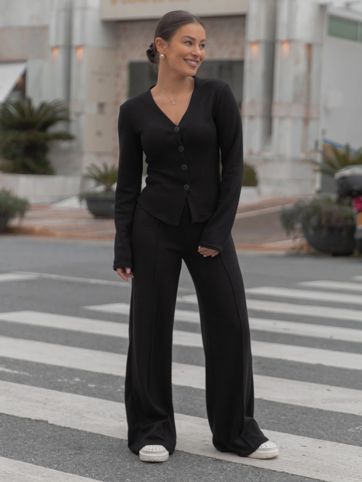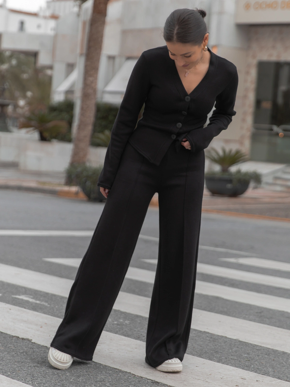 Dopasowany komplet uszyty z miękkiej swetrowej dzianiny o klasycznym prostym splocie. Góra dopasowana zapinana na guziki , bez ściągaczy , można ją nosić na różne sposoby i szerokie spodnie z gumką w pasie z przeszyciem wzdłuż nogawek .