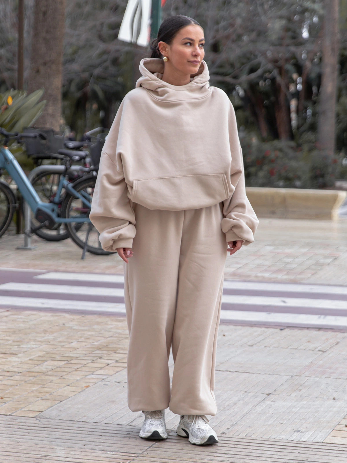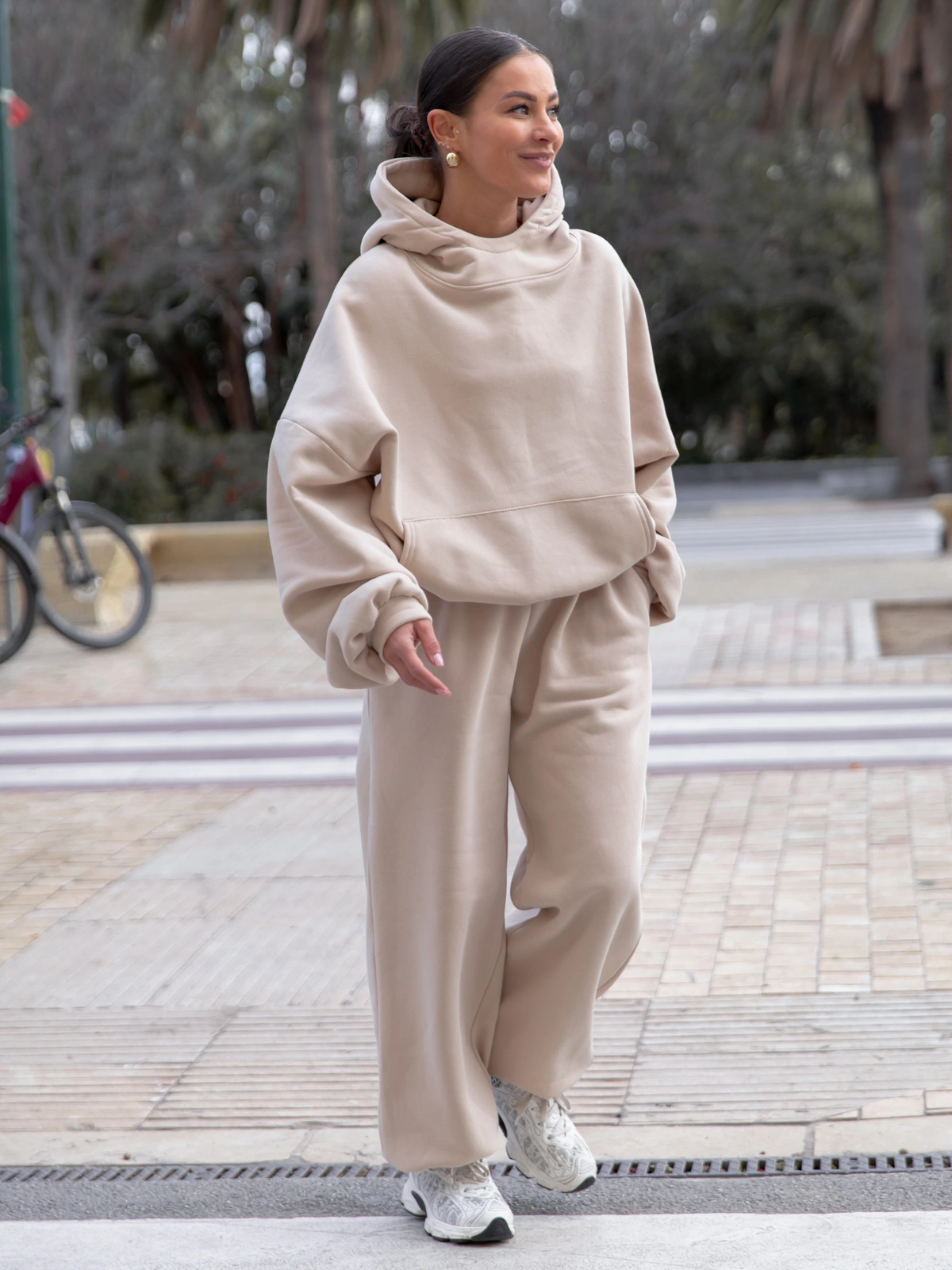 Stonowane kolory i prosty krój sprawiają, że spodnie można łatwo łączyć z różnymi elementami garderoby – od casualowych T-shirtów i bluz, po bardziej eleganckie dodatki, tworząc efekt sportowej elegancji. Delikatne przeszycia oraz praktyczne kieszenie podkreślają uniwersalny charakter spodni, dodając im jednocześnie subtelnego wyrazu i funkcjonalności.