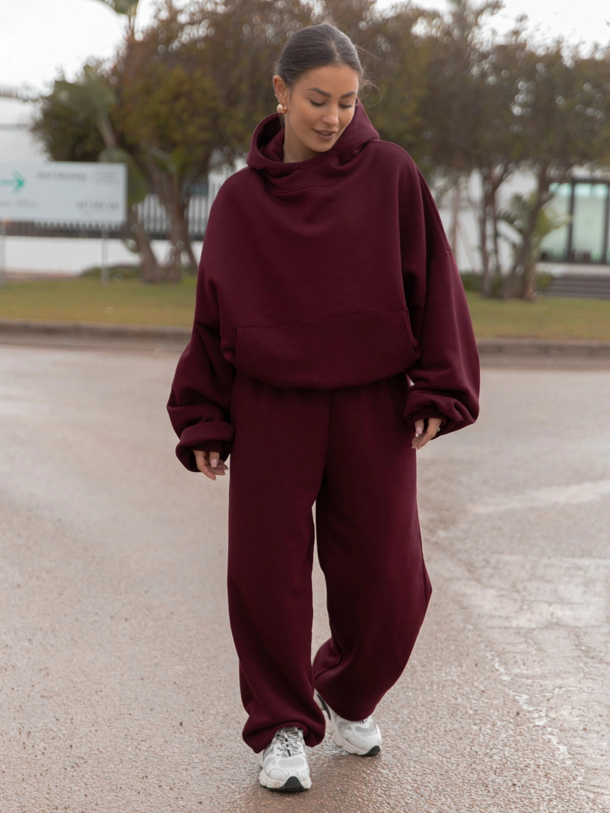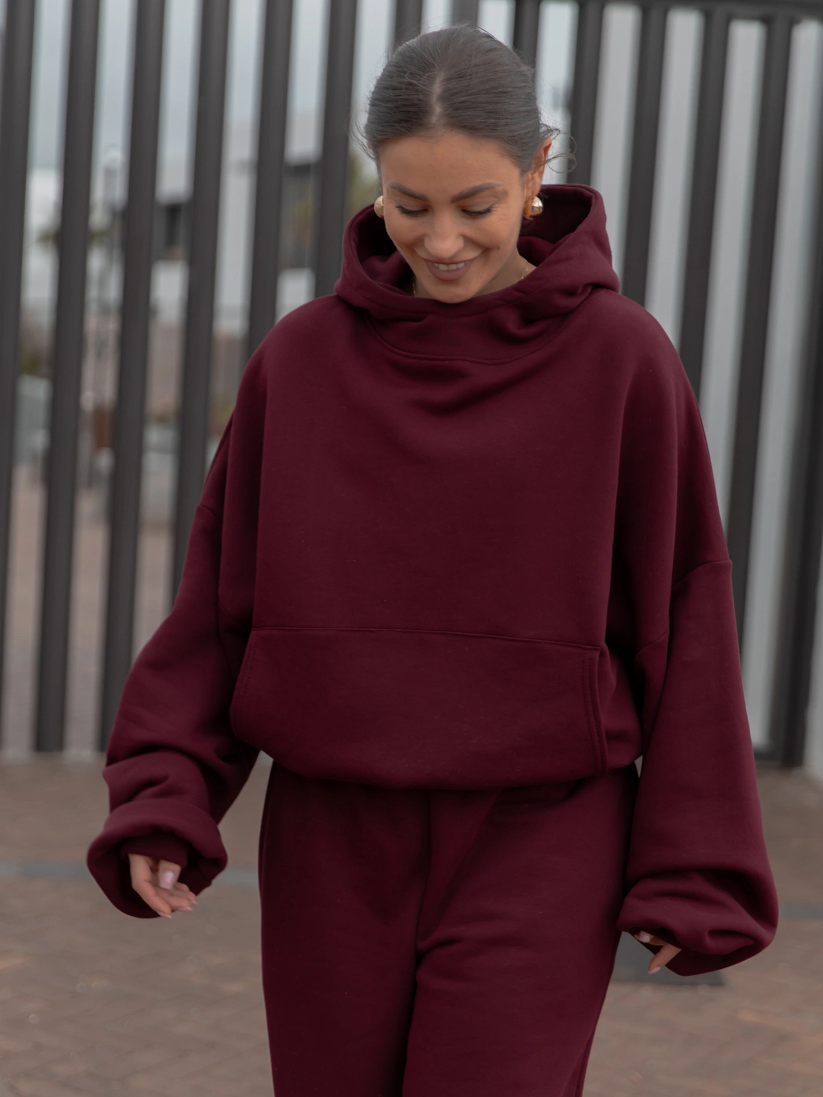 Viralowa Bawełniana BLUZA z drapanego dresu z kapturem na stójce z kieszeniami kangurka bordowa E1