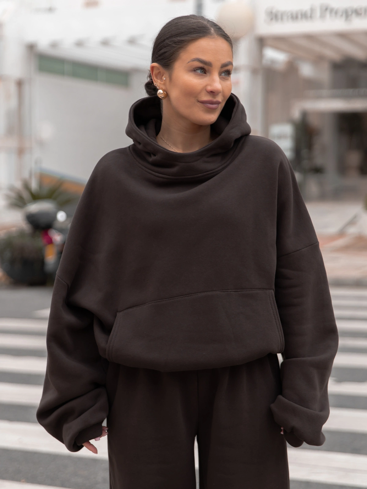 Viralowa Bawełniana BLUZA z drapanego dresu z kapturem na stójce z kieszeniami kangurka czekoladowa E1