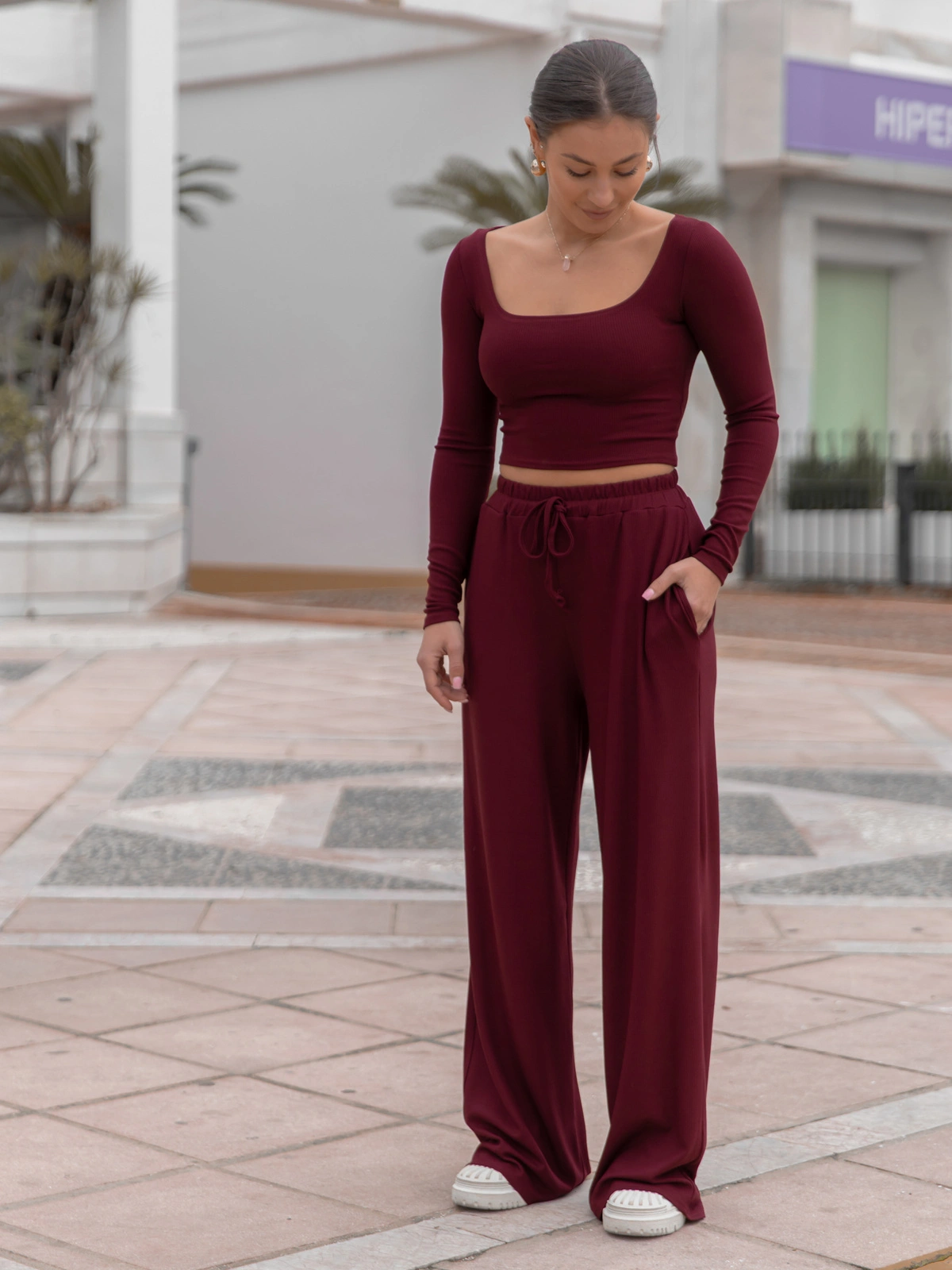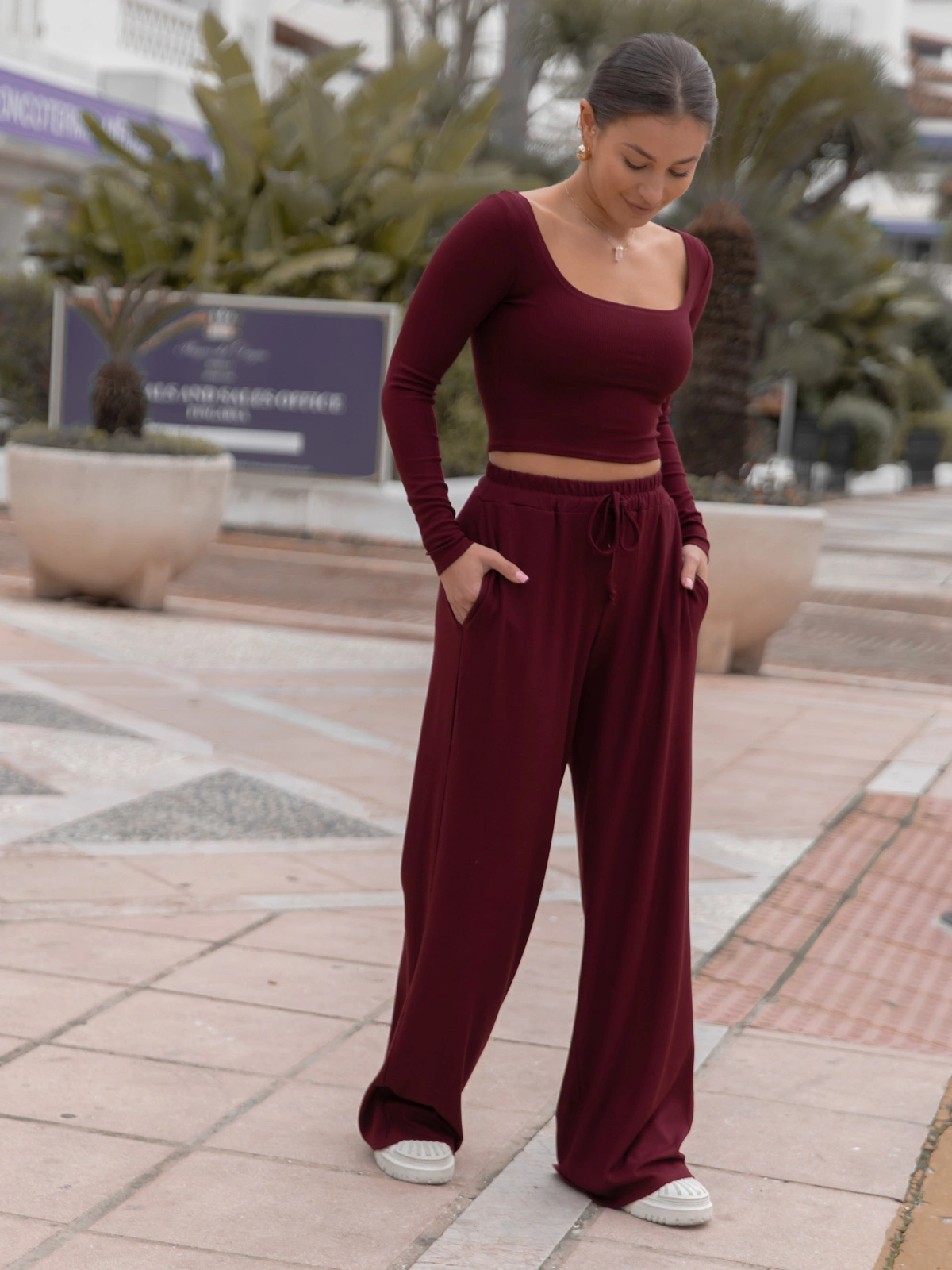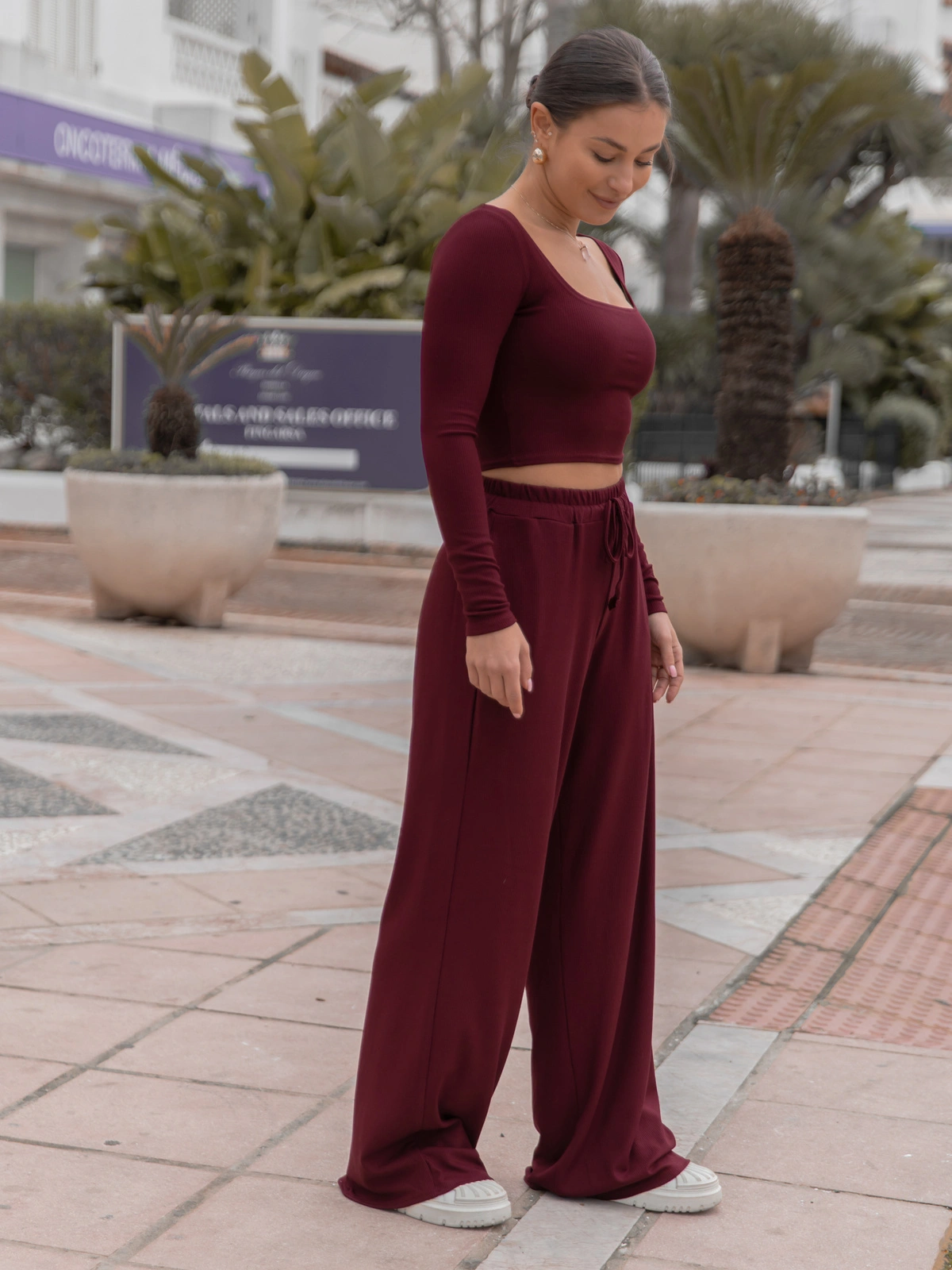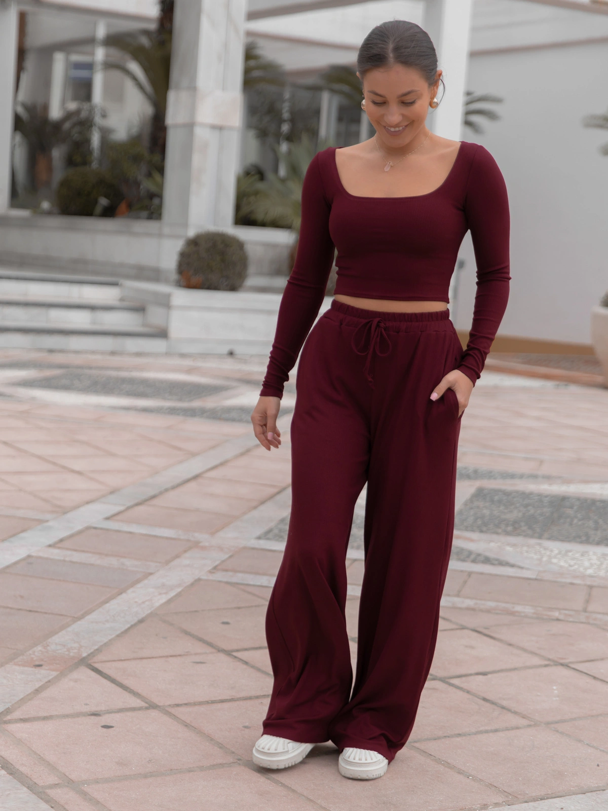 Codzienny KOMPLET krótka bluzka z kwadratowym dekoltem i luźne spodnie z gumką w pasie z prążkowanej dzianiny wiscoza i bawełna bordowy X558