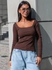 Basic Bawełniana BLUZKA z prążkowanej dzianiny z kwadratowym dekoltem brązowa X406